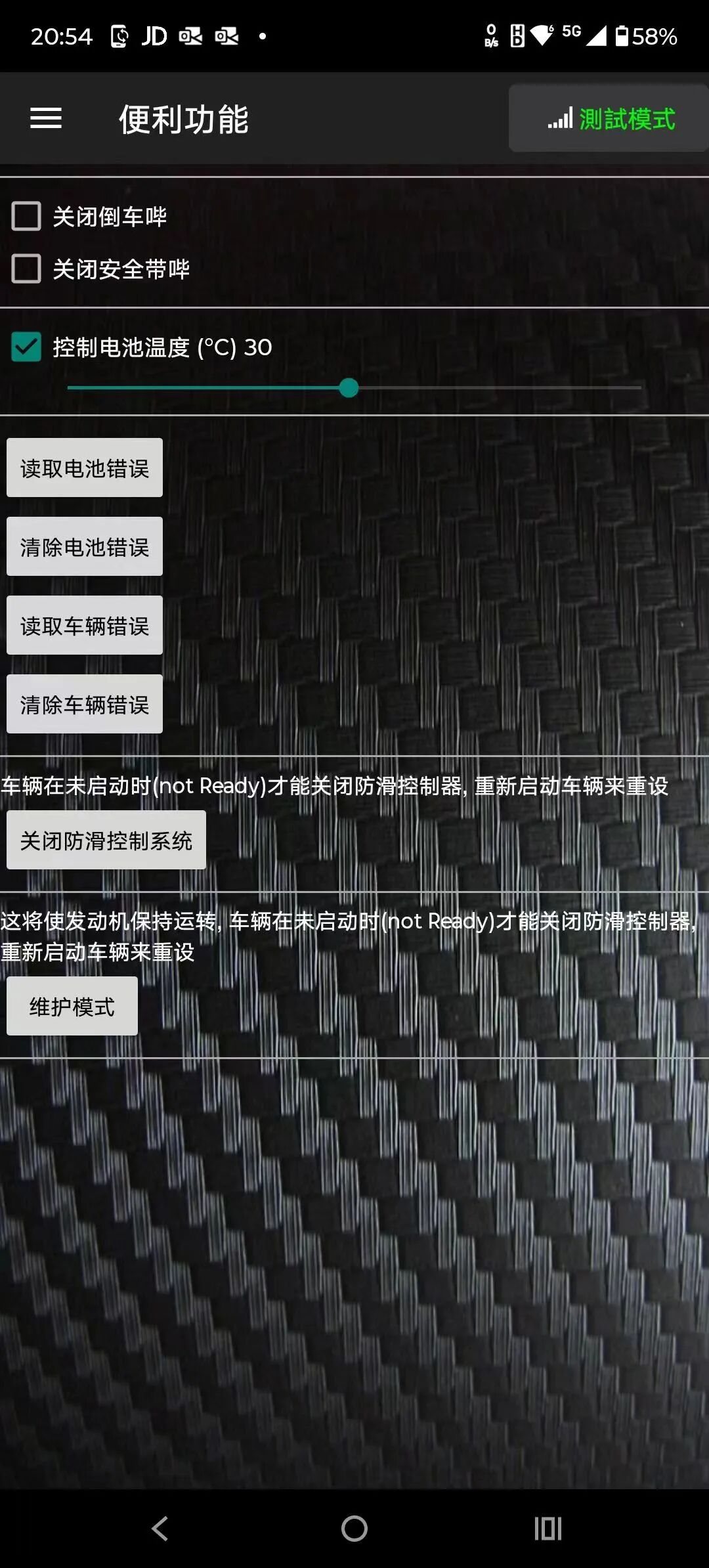如果是高级版本的OBD,还能通过打开HYBRDASSISTANT这个app去调整车子对于电池的一些设置,能更好的降低电池的运行温度。不过这个要每次进行设置,不能保存,所以用的时候会有点麻烦。我手上的是便宜版本,做不了修改,所以借用了车友群的车主的图片,需要进阶功能的用户可以考虑入手。