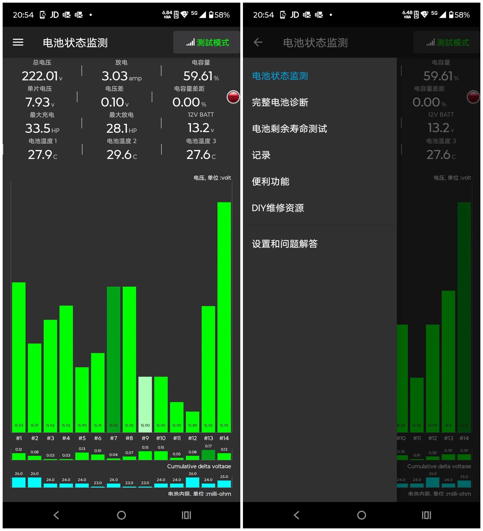 装好OBD之后,就能在APP里面到电芯的容量,电压和整体温度的情况,之前的文章中有不少人在问“镍氢和锂电工作原理不一样,只换了电芯,不需要设置电池策略和均衡性测试,到底稳不稳?“下图看出来,电池电芯的电压,标称是7.2,但实际上能去到8v左右,别看柱状图的电芯相差那么大,实际看图片就知道电压差就0.1v左右 ,换了电池之后,均衡性还是可以的。而工作温度大约维持在30度左右,状态还是挺理想。