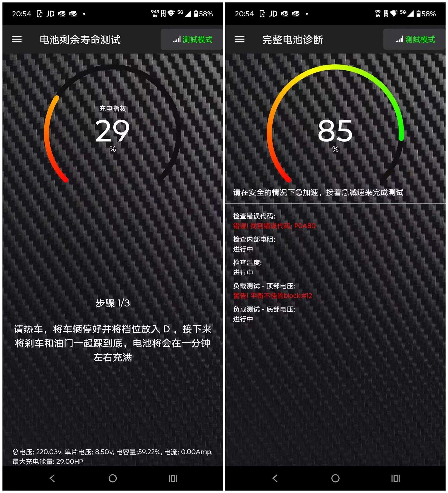 然后还可以通过通过OBD的监测,大约的看看电池剩余寿命的问题,不一定正确,但也是有个大概了解,我也做了一次,不过不敢做的太猛,结果也可以看下图。