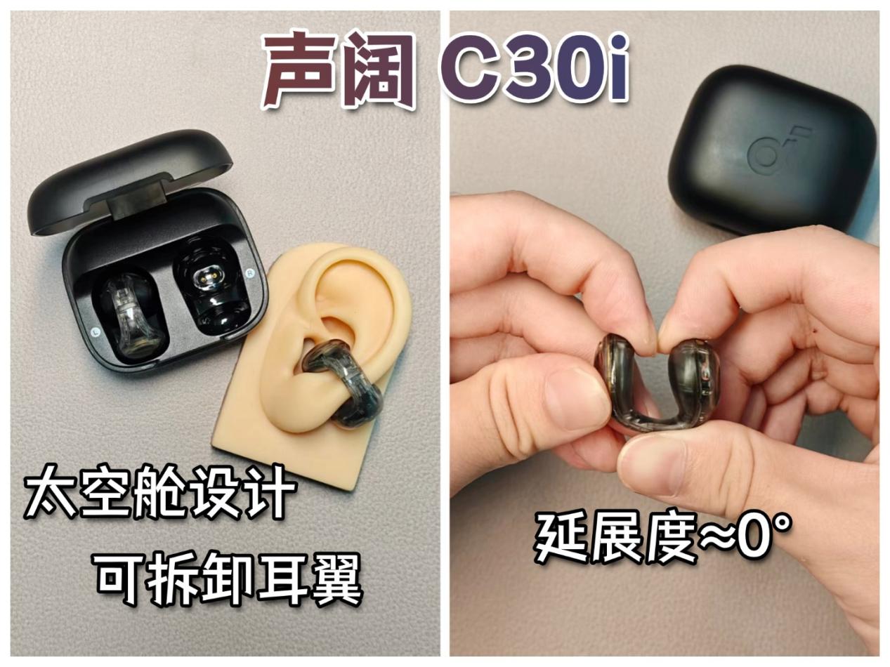 声阔C30i在佩戴上配备可拆卸耳翼,能适应不同耳型,但材质偏硬,长时间佩戴舒适度很差;音质上搭载大尺寸跑道型单元与环绕音技术,声音开阔饱满,听感富有层次;性能上支持一拖二连接,通话降噪清晰,且续航能满足长时间连续使用。虽然佩戴体验较硬,但还是有着出色的音质与续航表现,适合追求音质表现并且对佩戴要求不高的用户。