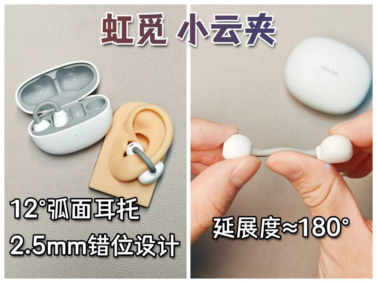 虹觅小云夹在佩戴上采用错位与弧面耳托设计,结合轻巧机身,长时间佩戴依然舒适。音质上搭载石墨烯振膜与全景空间音效,声音清晰自然,听感均衡,整体音质表现优秀。性能上支持实用的防漏音模式与双设备连接,具备日常防水和清晰通话,续航能满足全天使用。虽然其设计较为简洁,但综合佩戴、音质与防漏音表现,在入门价位中性价比非常突出。