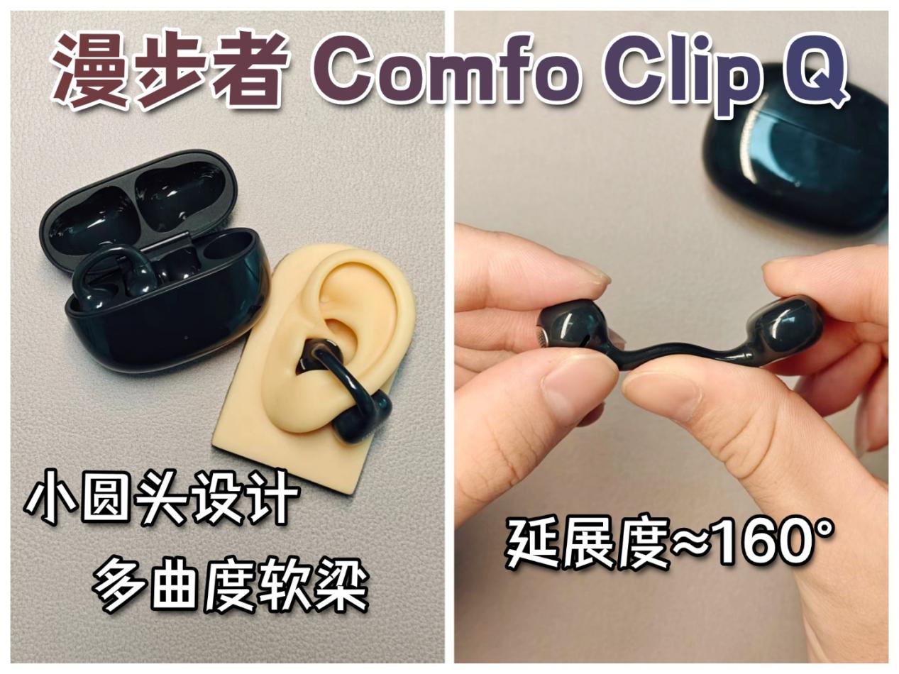漫步者Comfo Clip Q在佩戴上采用小圆头与多曲度软梁设计,能温和贴合耳部,长时间使用舒适感良好;音质上搭载钛度复合振膜,声音表现清晰但整体中规中矩;性能上具备高强度的防水能力,无惧汗水和雨水,并支持一拖二连接与清晰通话。虽然音质表现与防漏音能力尚有不足,但出色的佩戴舒适性与可靠的防水性能,还是日常使用中一个不错的选择。