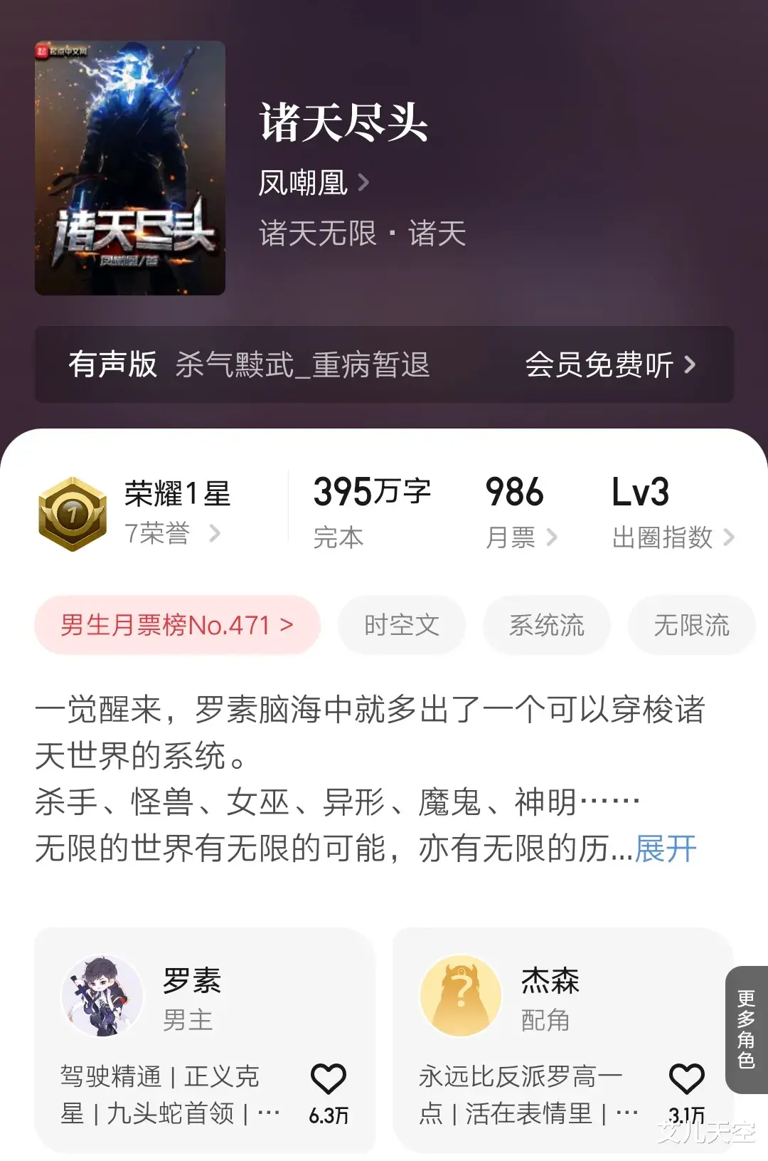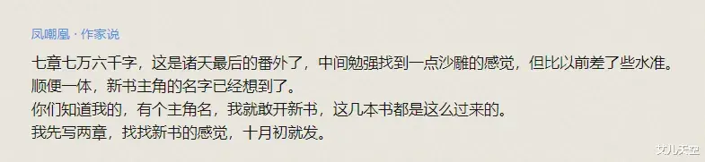 今年的新晋大神凤嘲凰在昨天凌晨一口气更新了《诸天尽头》七万六千字的番外,还是厉害的,不过这算是迟到的番外兑现。毕竟隔了三年,他都写完另外两本小说《在港综成为传说》《修仙就是这样子》了。