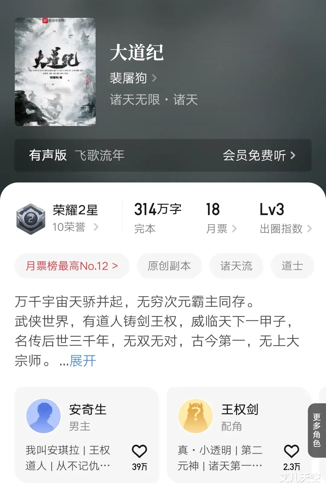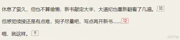 裴屠狗也在昨天更新了一下八月份突然完结的《诸界第一因》的番外,末尾更是说了一下,新书已经敲定大半,然后重新翻看了上上本小说《大道纪》,准备将承诺的后续内容续上。只是时间隔了也有点久,能不能找回状态看着也不好说。
