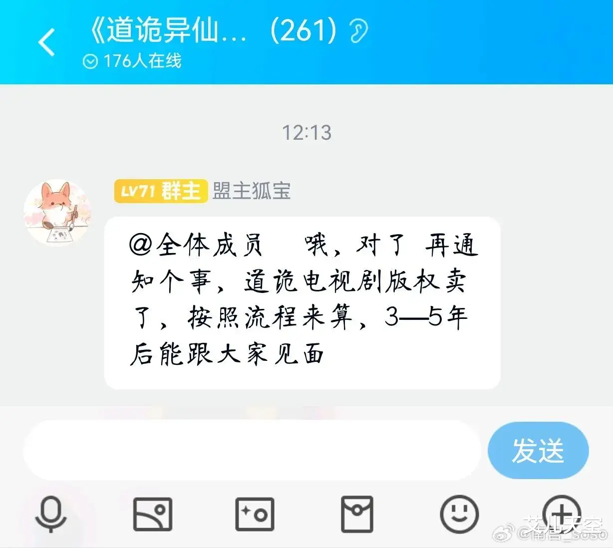 而就在今天,也流传出来《道诡异仙》电视剧版权售出的消息了,主要是狐尾自己在盟群的一个通知,然后就有了下面的截图。