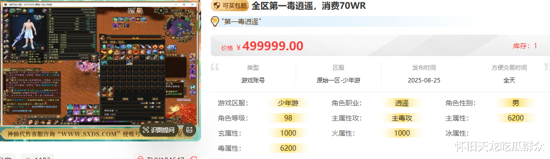号肯定不错,这原始服尤其是少年游的东西也确是贵,没V的我连排队都不配。但100w的挂价估计也只是挂着看看,下面也还有个标榜第一的逍遥,卖价砍一半挂的50w。同样是少年游,但加了个定语——第一毒逍遥,声称花费了70多w打造的。