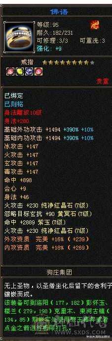 装备里最吸睛的一个是护符:火毒玄3属攻+体力、命中、会心和身法,另一个是戒指:4属攻+命中、会心、身法。整体养成都不错,满7宝石,雕纹满十,强化9。