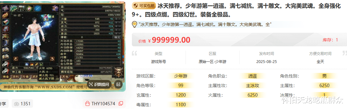 第一个挂价百万,标榜少年游第一。可以看到面板火攻6250,毒攻玄攻都是1000多。血上限接近39万,命中5万,闪避也是2万多。