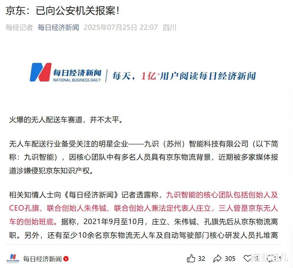 7月25日,京东首次对外确认,已就九识智能涉嫌侵犯知识产权向公安机关报案。京东在回复《每日经济新闻》的声明中称:“经过多方调查,京东已经掌握了大量九识智能相关侵权证据,已于2024年11月20日正式向公安机关报案。目前该案件正在调查中。”