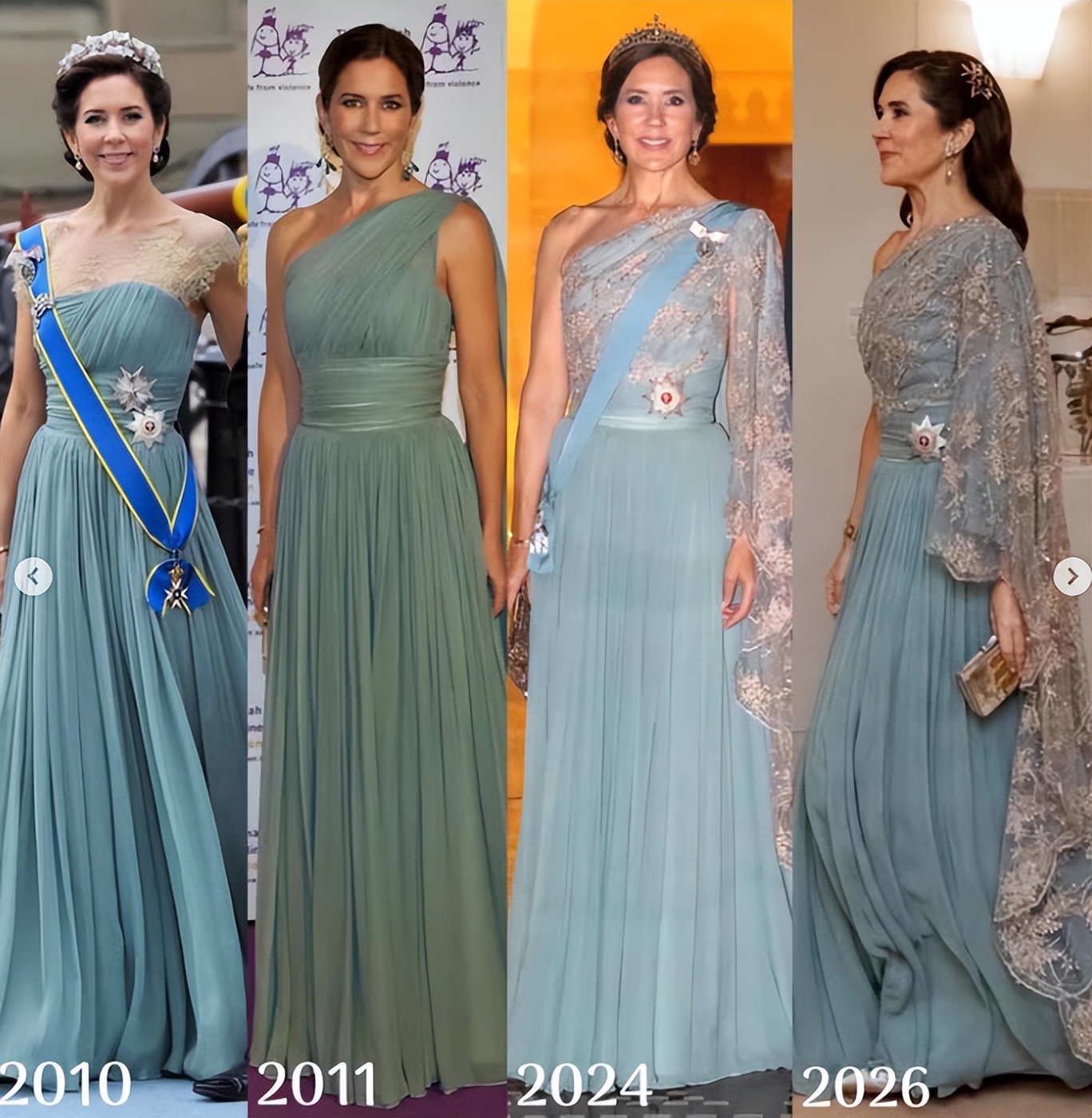 夜间的薄荷绿礼服来自本土设计师Jesper Høvring,她已经断断续续穿了16年,现在见到的是第三个版本