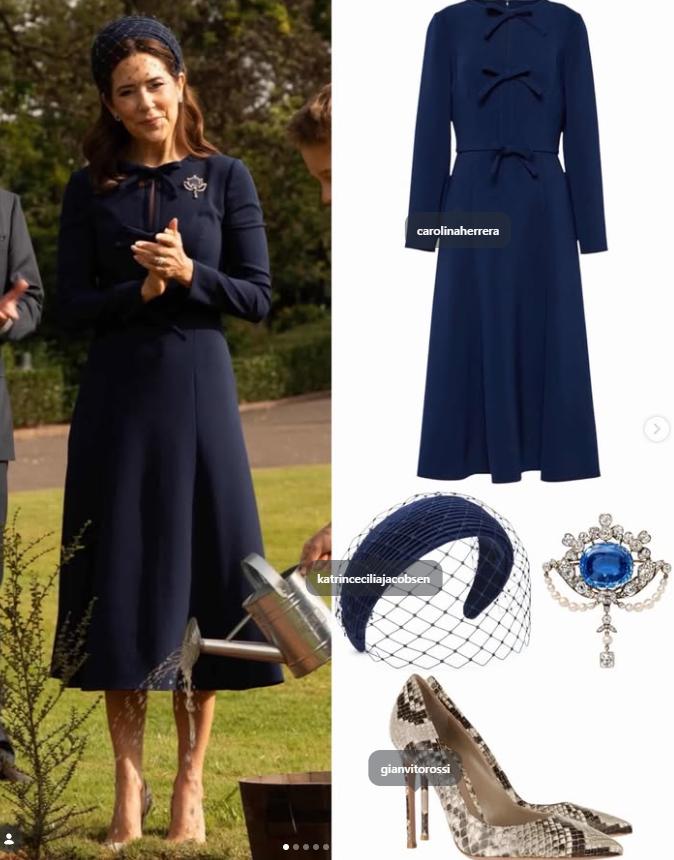 玛丽宝蓝色裙子来自carolina herrera,细高跟踩草地厉害极了