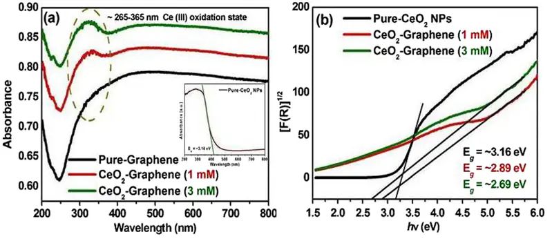 图5:CeO2基材料的UV-Vis DRS与Tauc外推:Ce3+/氧空位引起的吸收带与带隙变化示例。DOI:10.1038/s41598-017-06139-6