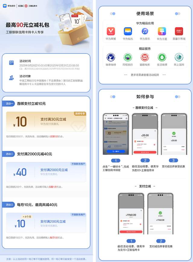 而除了这些日常生活的优惠外,双十一想必很多朋友还在观望电子产品,考虑到这些小伙伴的需求,华为支付同样有惊喜奉上——在华为商城购物时,华为支付还联合了工商银行等“满减搭子”,推出了支付满减活动。下单时选用指定的银行卡支付,满一定金额就能立减。买手机、买平板,花大钱也能省小钱,成年人的快乐就是这么朴实无华。