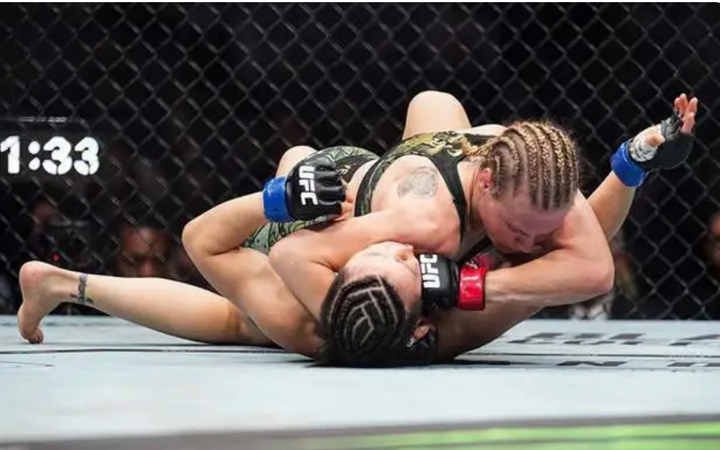 第三回合,张伟丽调整战术,试图在站立对峙中寻找突破口。但舍甫琴科凭借出色的距离控制和臂展优势占据主动,后半段突然发起近身抱摔,再次将比赛拖入地面并完成压制,张伟丽的进攻节奏屡屡被打断。