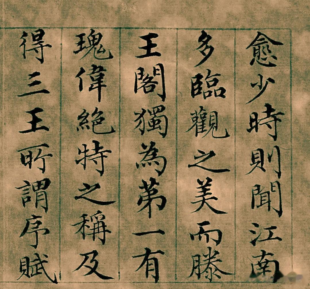 黄钺的楷书《滕王阁序》,堪称清代馆阁体中的雅正之作。其笔法深得唐楷精髓,尤其颜鲁公的浑厚与欧阳询的严谨融于一体,点画精到,结字方整,于规整中见从容气度。