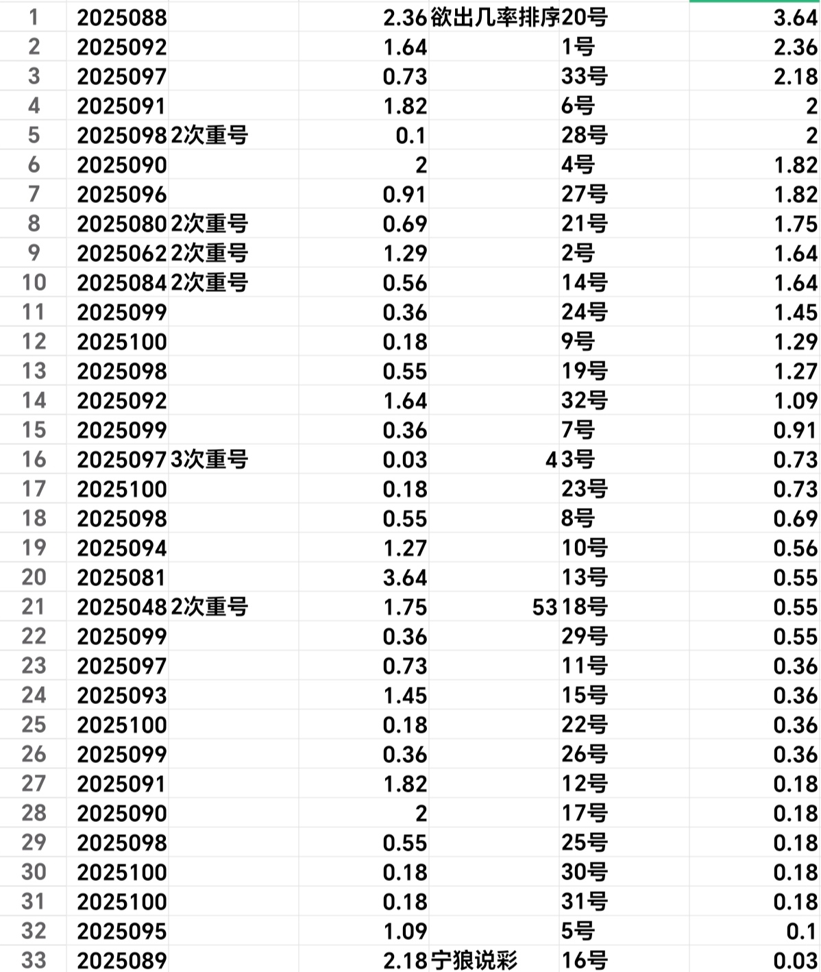红色球21号上次连续两期开出时间2025年第47~48期,2次重号当前遗漏(101-48)➗平均遗漏5.5➗5.5≈欲出率1.75