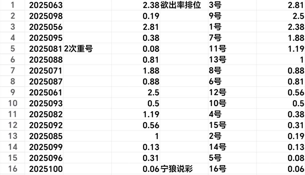 蓝色球5号上次连续两期开出时间2025年第80~81期,2次重号当前遗漏(101-81)➗平均遗漏16➗16≈欲出率0.08。