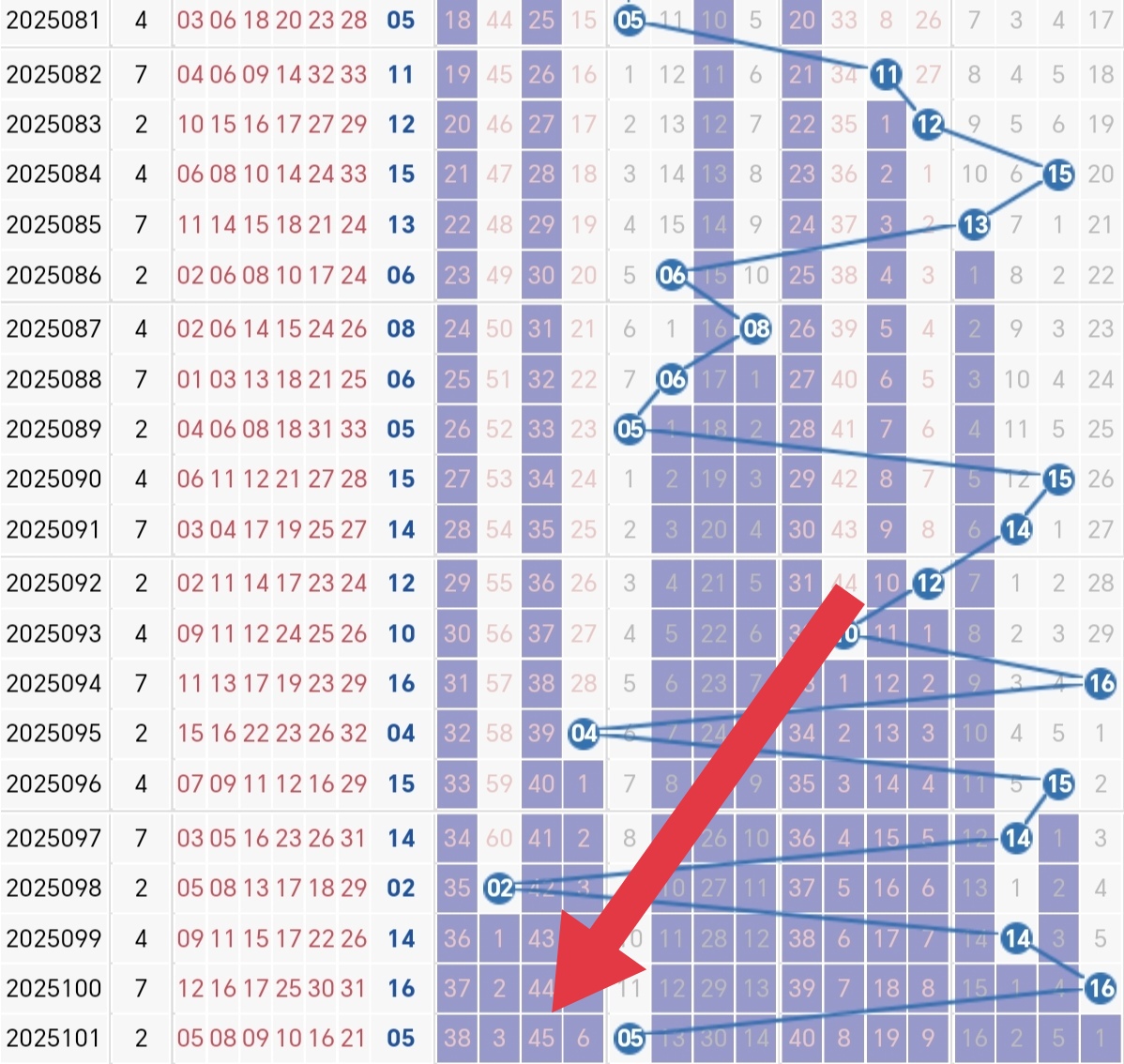红色球16号上次连续三期开出时间2025年第95~97期,3次重号当前遗漏(101-97)➗平均遗漏5.5➗5.5➗5.5≈欲出率0.03