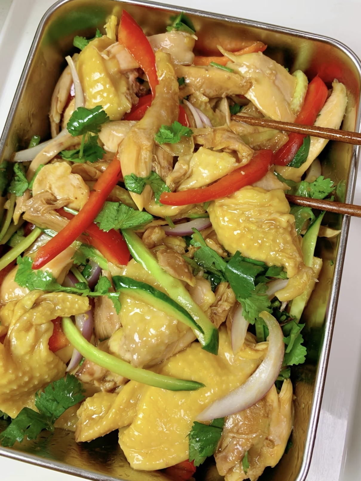 食材:鸡腿,葱,姜,洋葱,香菜,黄瓜丝,红椒丝