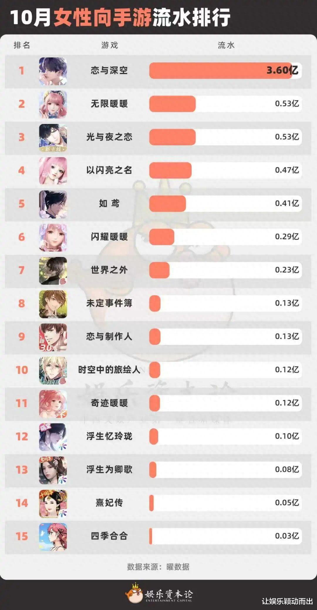《恋与深空》仍旧领跑,但已经很难像一年前那样,动辄在IOS畅销榜上超抖音、压《王者》;《如鸢》因去年下半年出现的一系列节奏转向低调,目前与《光与夜之恋》争夺第二名宝座;《世界之外》经历了“消费欺诈”、制作人离职等动荡,流水大幅下滑,十月份流水仅2316万元,还没打过已经公测5年的《闪耀暖暖》。