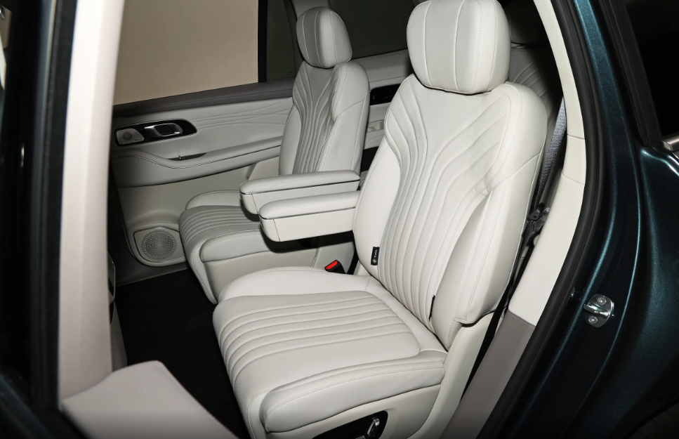 中间岛台的布局设计很传统,没什么特别的地方,车内采用标准六座布局,主驾驶位采用主动侧翼支撑、自适应腰托以及16点按摩,该有的舒适性配置也不会少,不过高低配之间肯定有一定区别。第二排配备两个独立航空座椅,第二排配备有腿托,各种舒适性配置统统安排,毕竟每款大6座SUV的第二排位置都是重中之重。