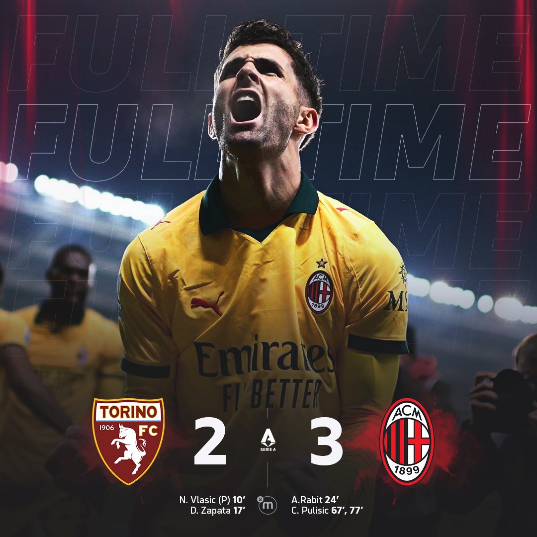 凭借替补登场的普利西奇上演梅开二度,米兰在都灵上演大逆转,本轮结束后重新登顶意甲榜首。