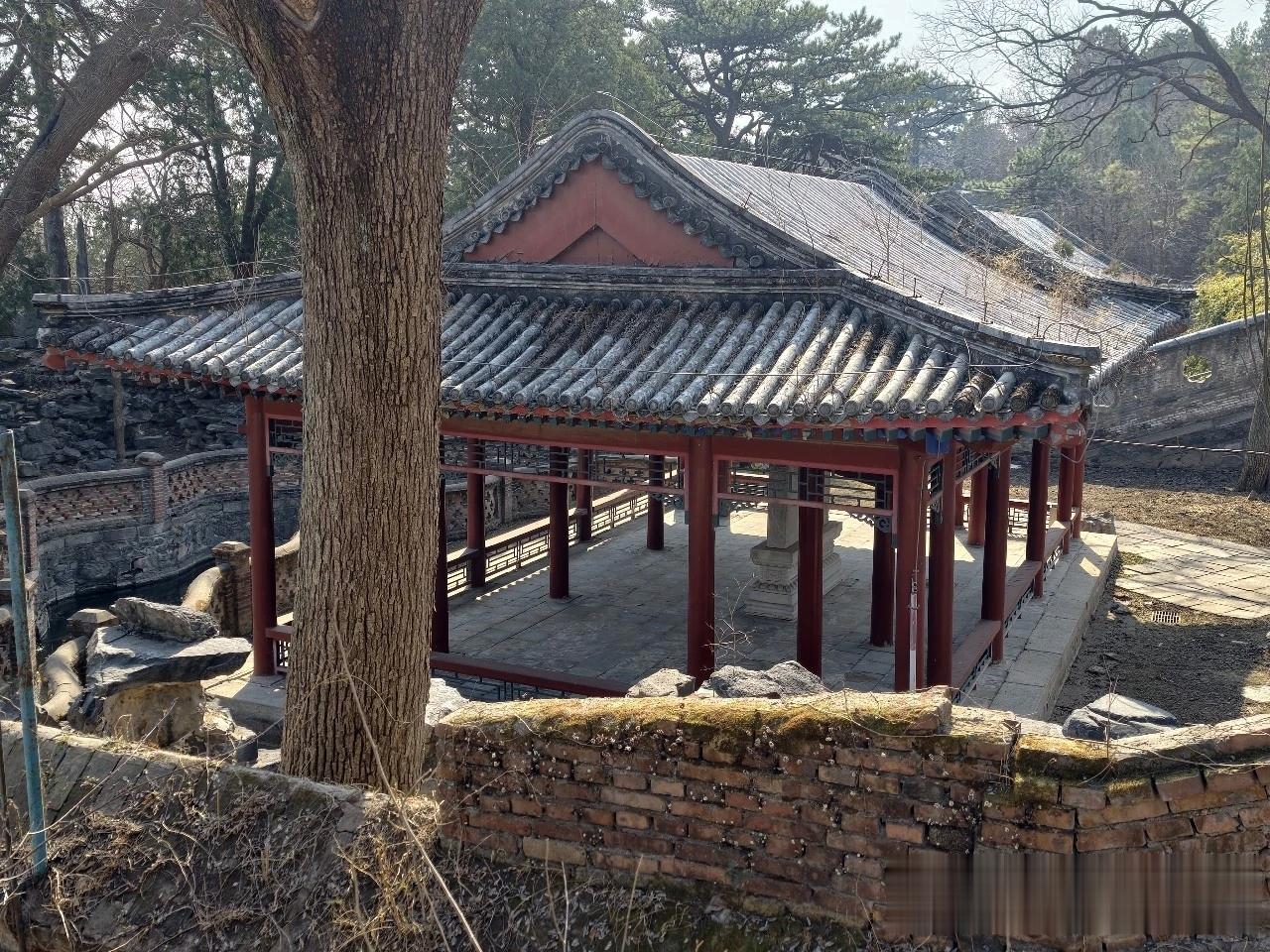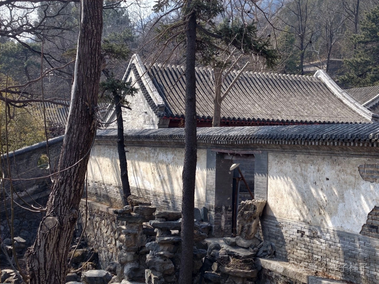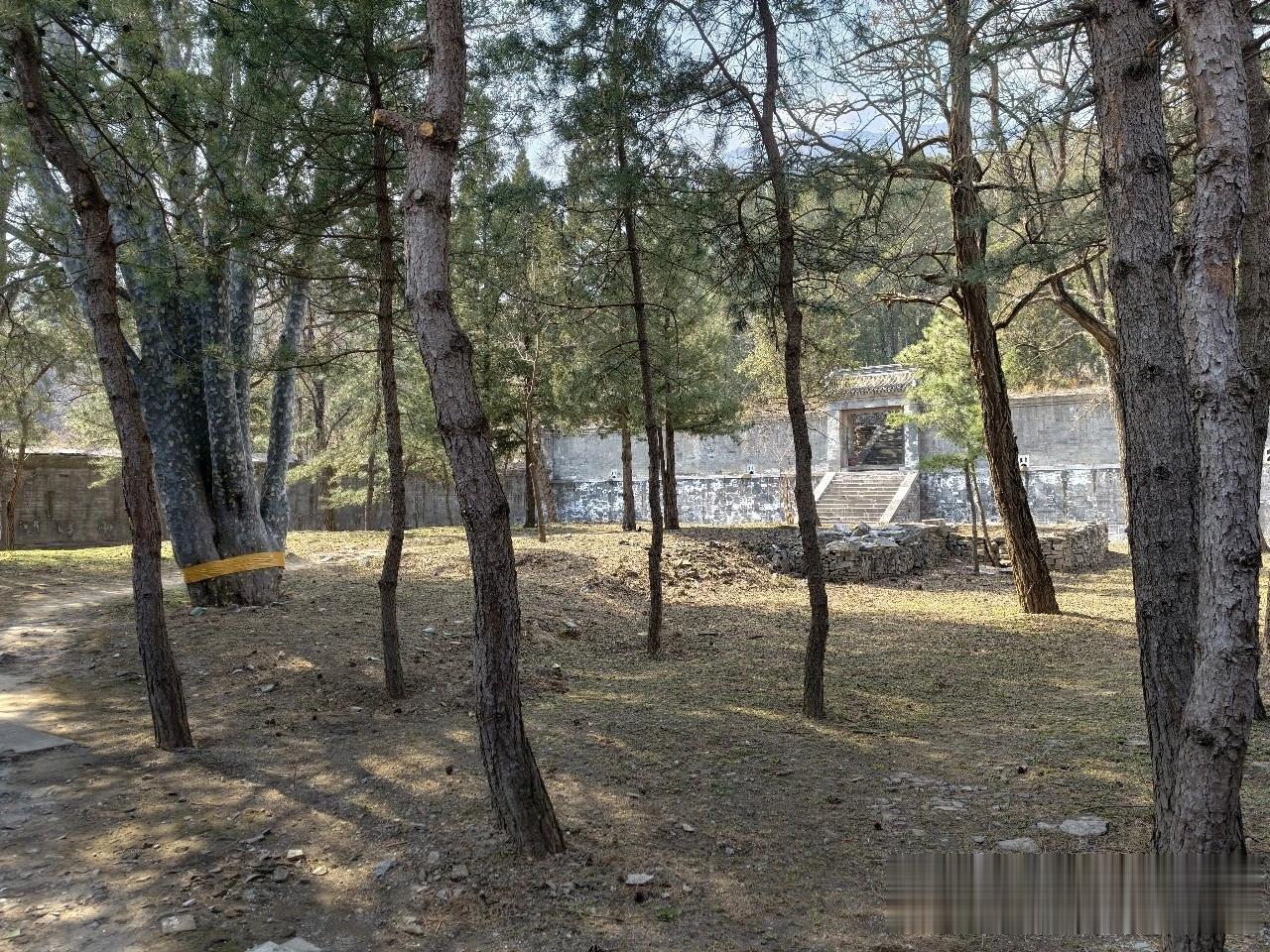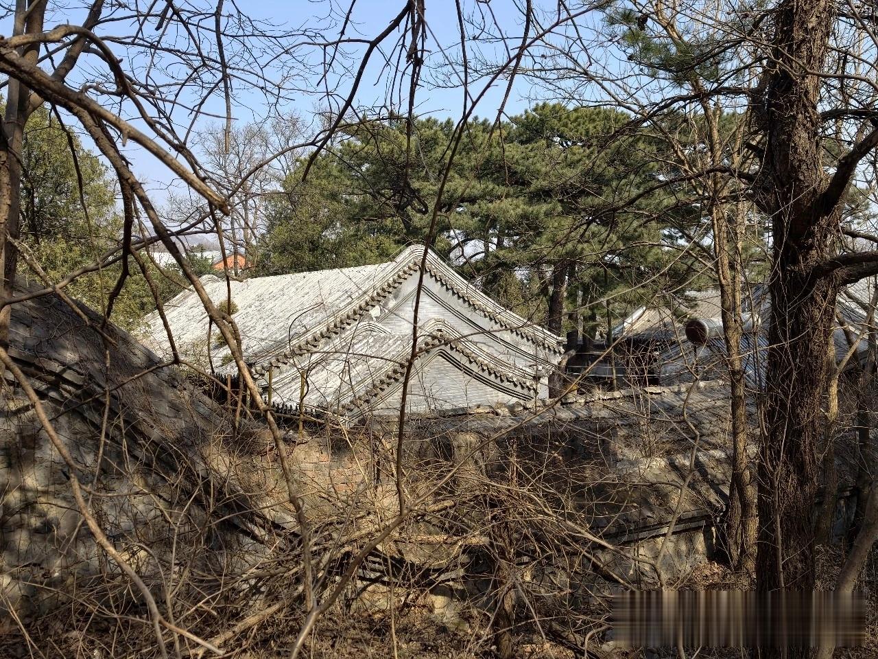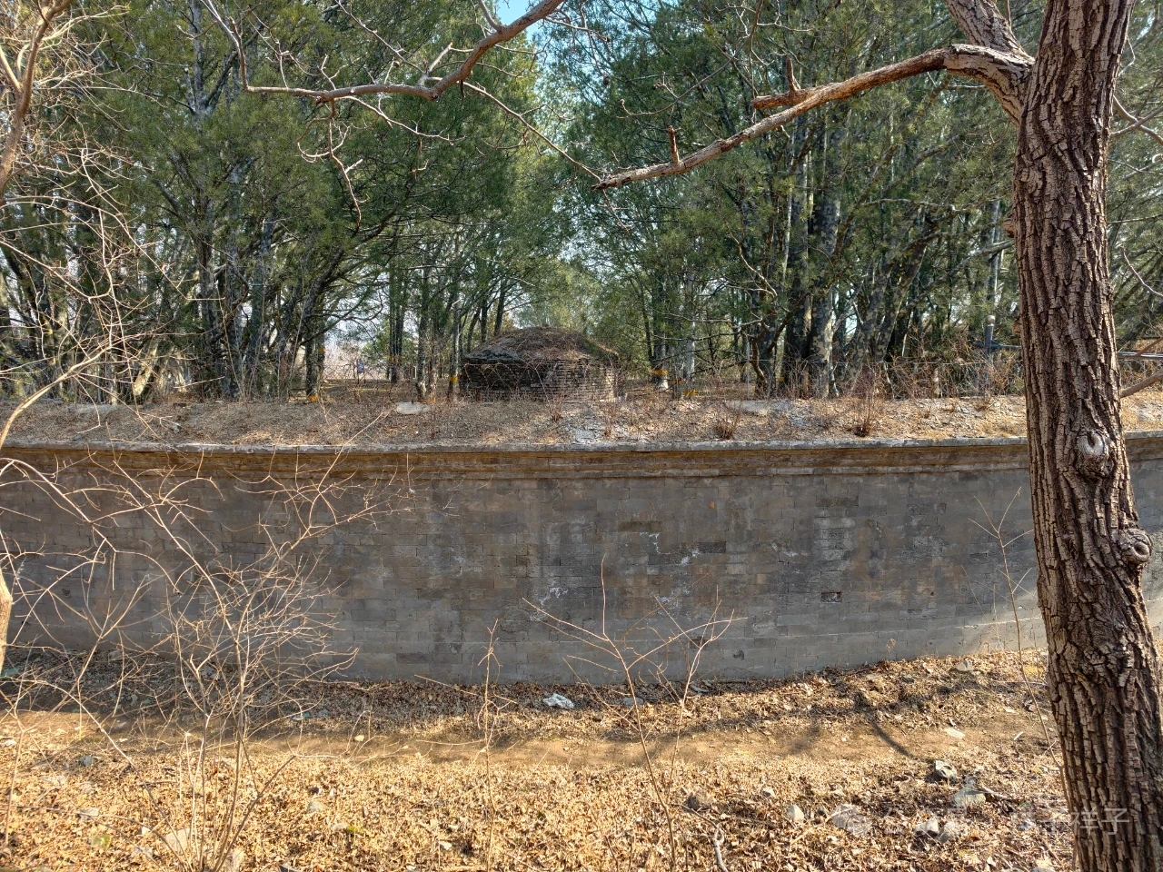 香水院这块风水宝地,被七王爷看中后,为了修建园寝,香水院行宫的旧址几乎被破坏殆尽!!从此处下望,明显可见阳宅和阴宅后面的高大石砌围墙,也隐约能看到阴宅里面的宝顶。