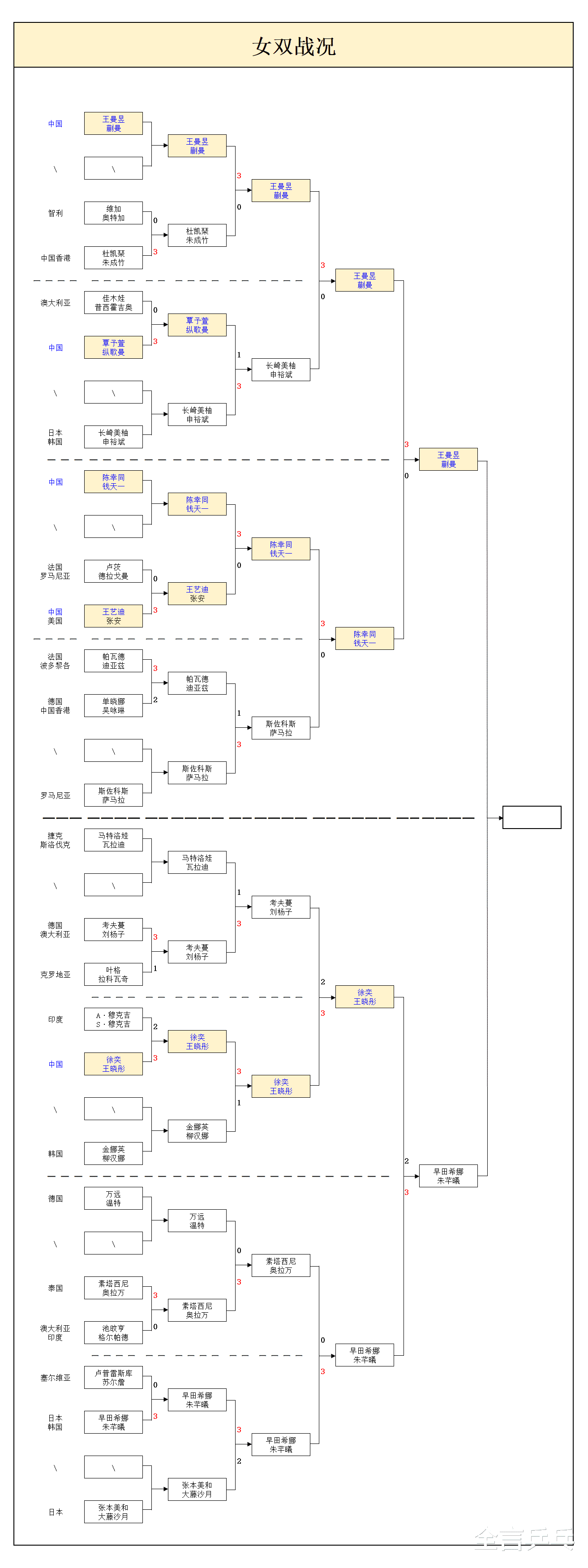 早田希娜/朱芊曦:3-0卢普雷斯库/苏尔詹(塞尔维亚)、3-2张本美和/大藤沙月(日本)、3-0素塔西尼/奥拉万(泰国)、3-2徐奕/王晓彤。