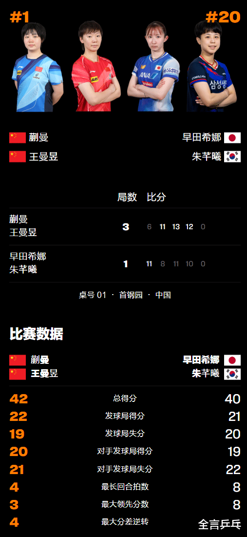 比赛开始后王曼昱/蒯曼开局不利,上来就不断陷入被动,很快就1-9落后被拉开8分差距,随后奋起反击追回4分,但很快又陷入被动5-10被早田希娜/朱芊曦拿到5个局点,最终以6-11败北无缘拔得头筹,显然没有进入状态。