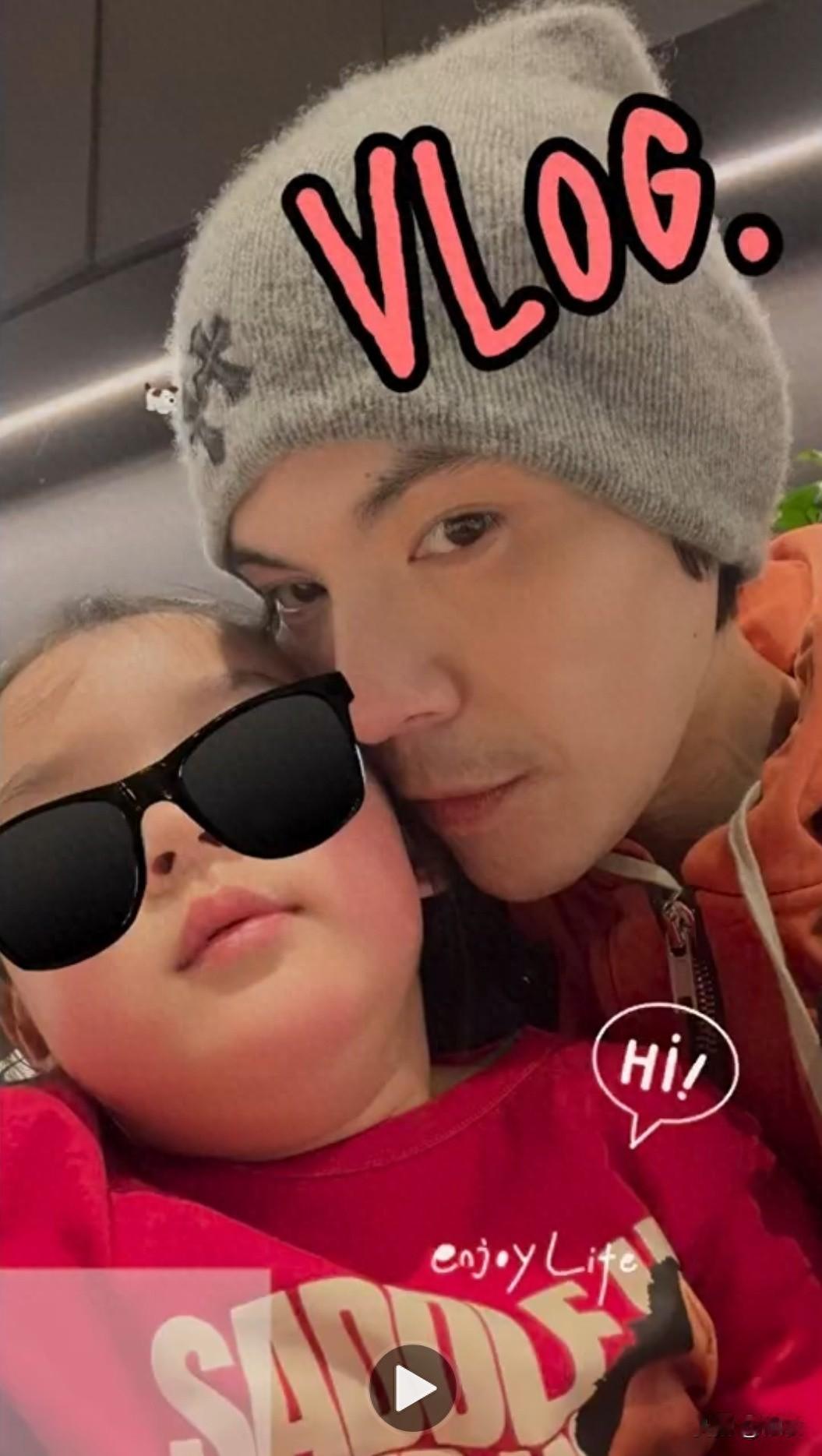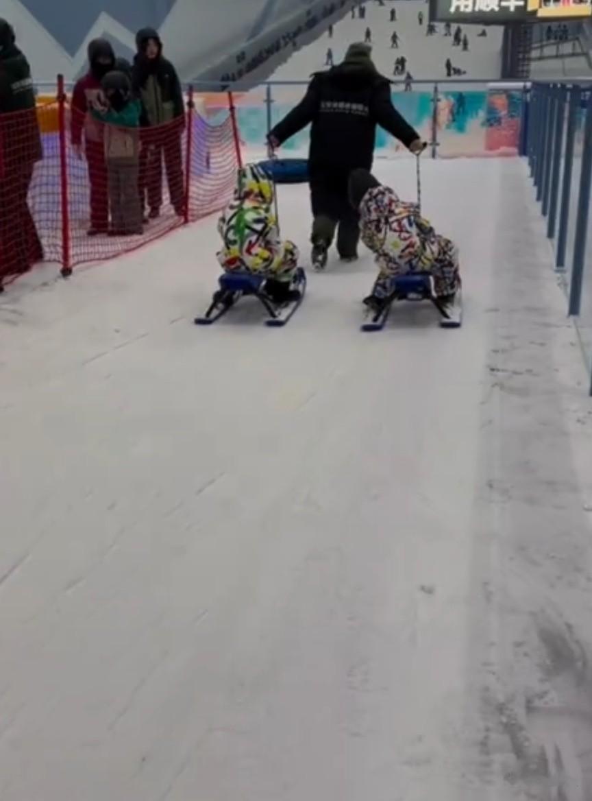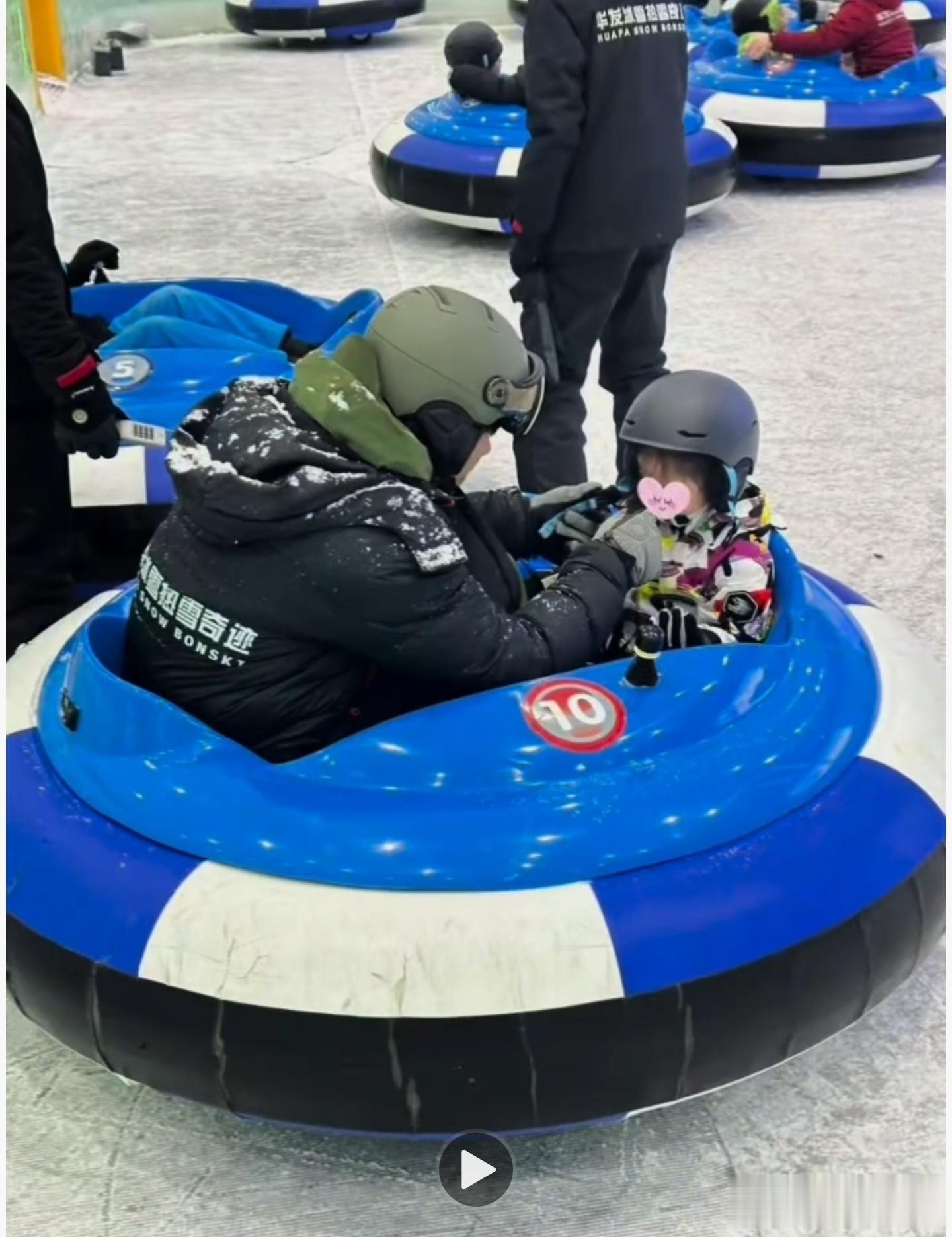 在滑雪场内的冰上区域向佐和孩子还玩起了碰碰车,他穿着黑色带字母的外套,戴着绿色头盔和孩子在蓝色碰碰车里欢笑玩耍,亲子互动甜蜜满分。