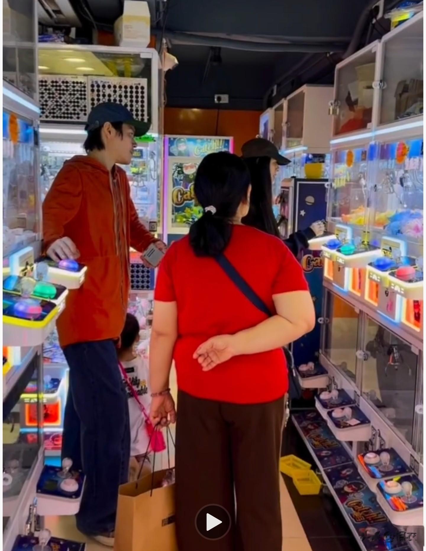 向佐的妻子郭碧婷也现身了,但是没有给正脸,打扮却挺她酷的,戴着灰色棒球帽长发披肩穿着深色连帽衫,下身牛仔裤,和向佐还有孩子一起专注地研究抓娃娃技巧画面超温馨。