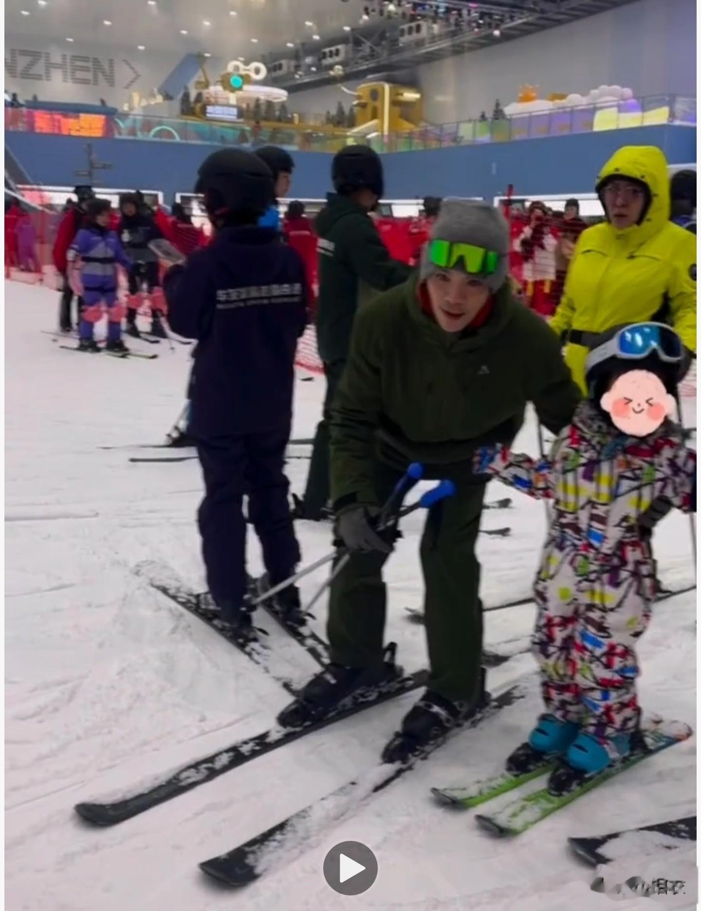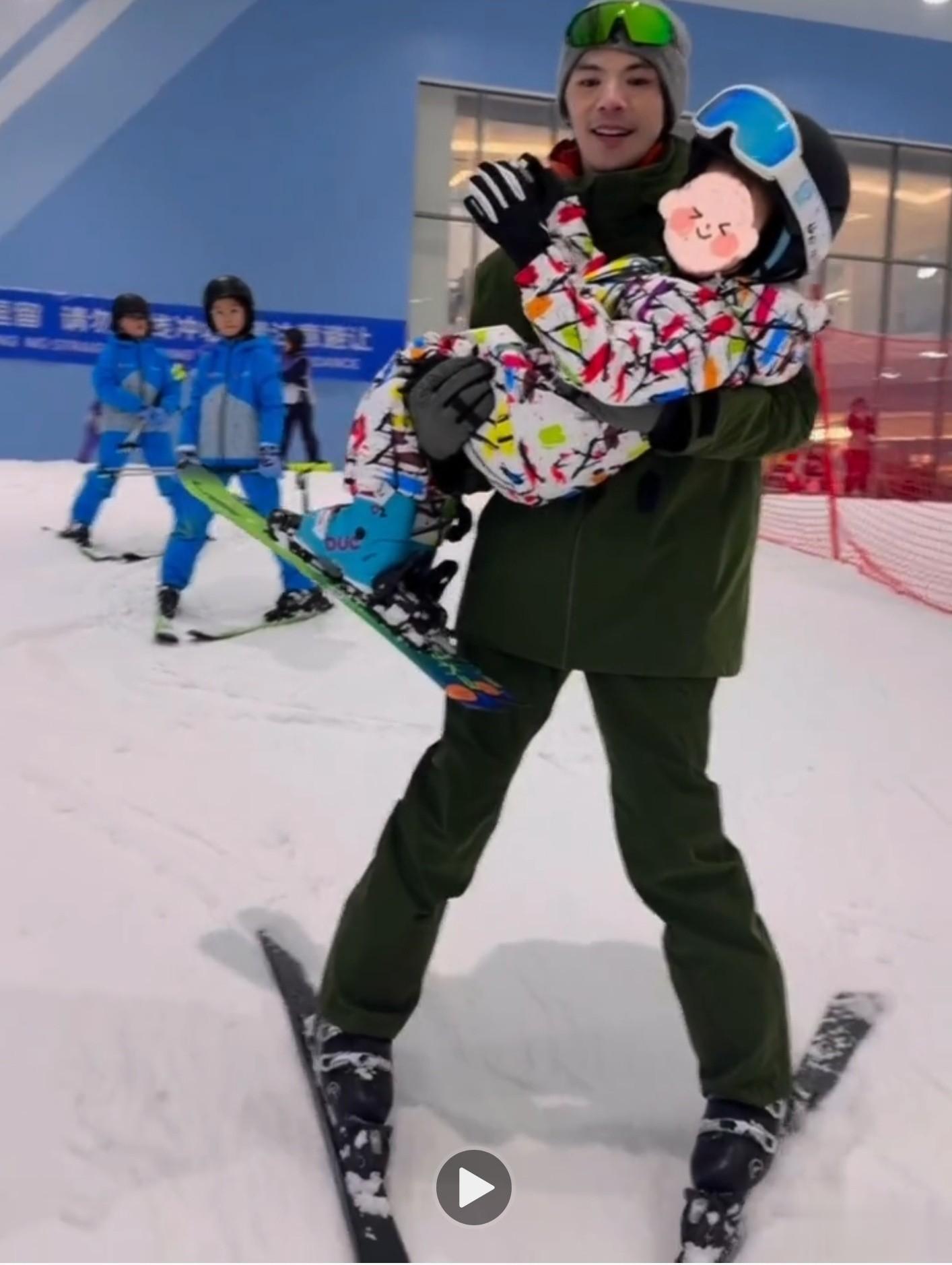向佐一身墨绿色滑雪服搭配灰色针织帽帅气又干练,在滑雪场上他耐心地陪着孩子,一会儿抱着穿着彩色滑雪服的孩子一会儿牵着孩子的手教滑雪,动作娴熟又充满爱意。
