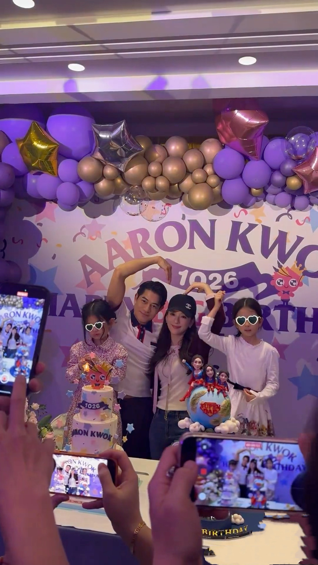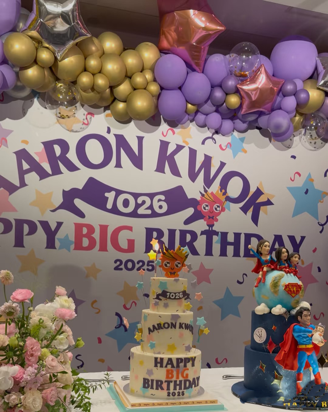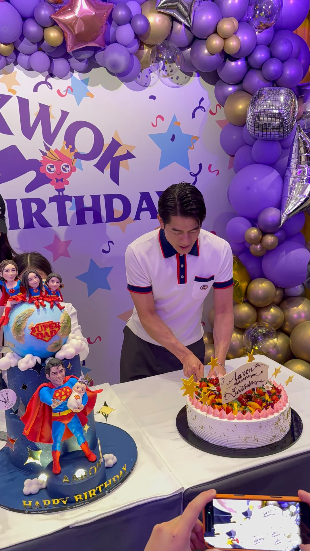 这场生日宴是紫色调,还做了好几个可爱有趣的大蛋糕。其中一个蛋糕是超人爸爸抱着襁褓中的孩子,还有妈妈带着2个女儿,这就是他们一家人的写照吧。
