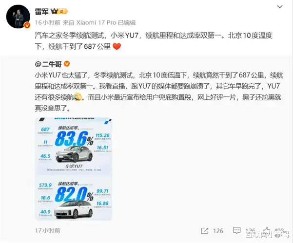 雷军看到博主发文后,火速转发并配文:“汽车之家冬季续航测试,小米YU7,续航里程和达成率双第一。”