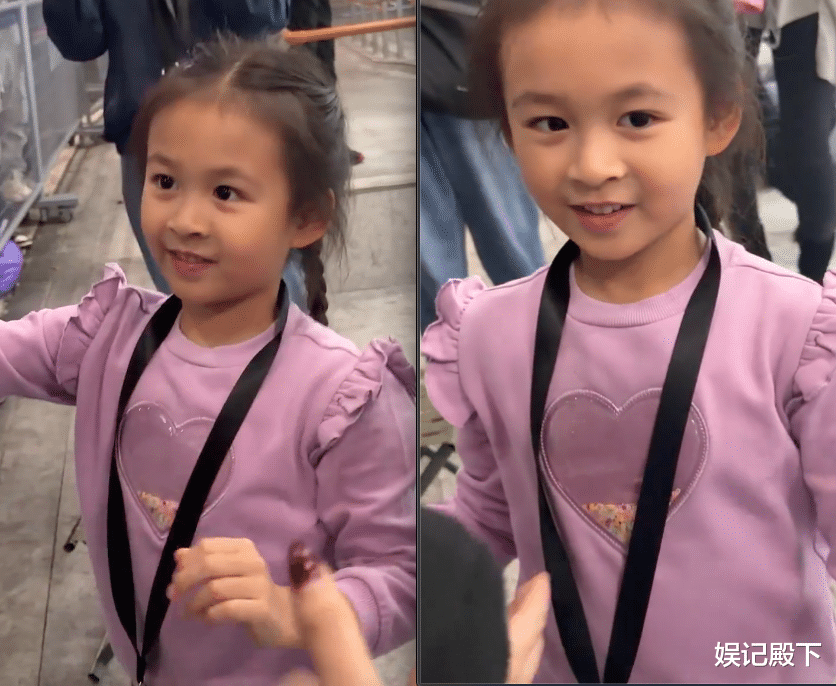 从演出后台出来的她身穿紫色衣服,像个小花童一样,面对众人的围观一点也不怯场,大大方方的接收粉丝们递过来的卡片。