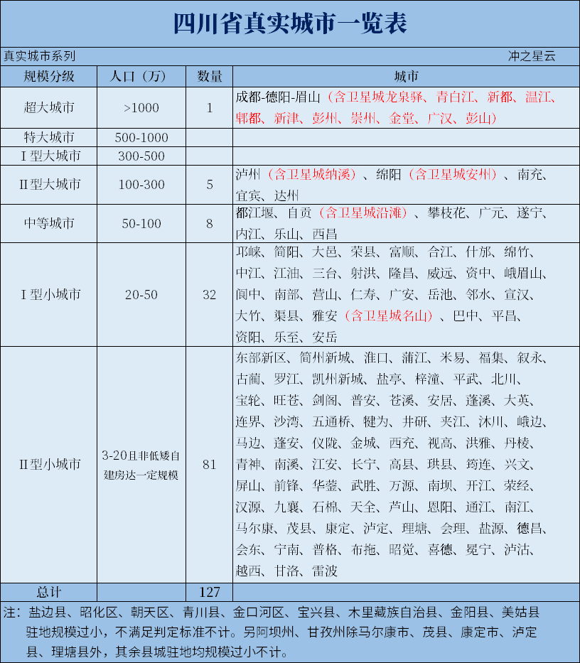 经判定统计,四川省共有127座建成区独立、完整的真实城市。盐边县、昭化区、朝天区、青川县、金口河区、宝兴县、木里藏族自治县、金阳县、美姑县因驻地规模过小,达不到城市的判定标准,在此不计。阿坝州、甘孜州除马尔康市、茂县、康定市、泸定县、理塘县外,其余县城驻地均规模过小,在此不计。