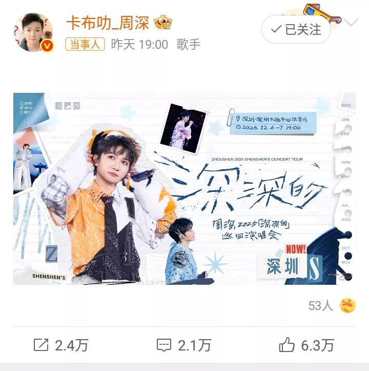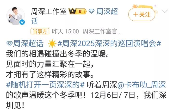 这就是歌手和歌迷的亲切感,地位平等,平易近人!周深工作室在社交平台发文,我们的相遇碰撞出冬季的温暖。这就是周深深圳演唱会的意义所在!用歌声温暖冬季,用相遇见证友情,便是歌手的至高境界!歌手周深在社交平台发文,一张大气的宣传海报,引发众多观众关注!海报中的人物,正是歌手周深!