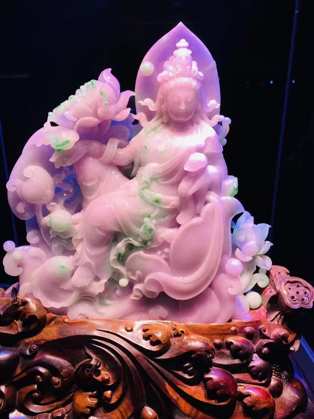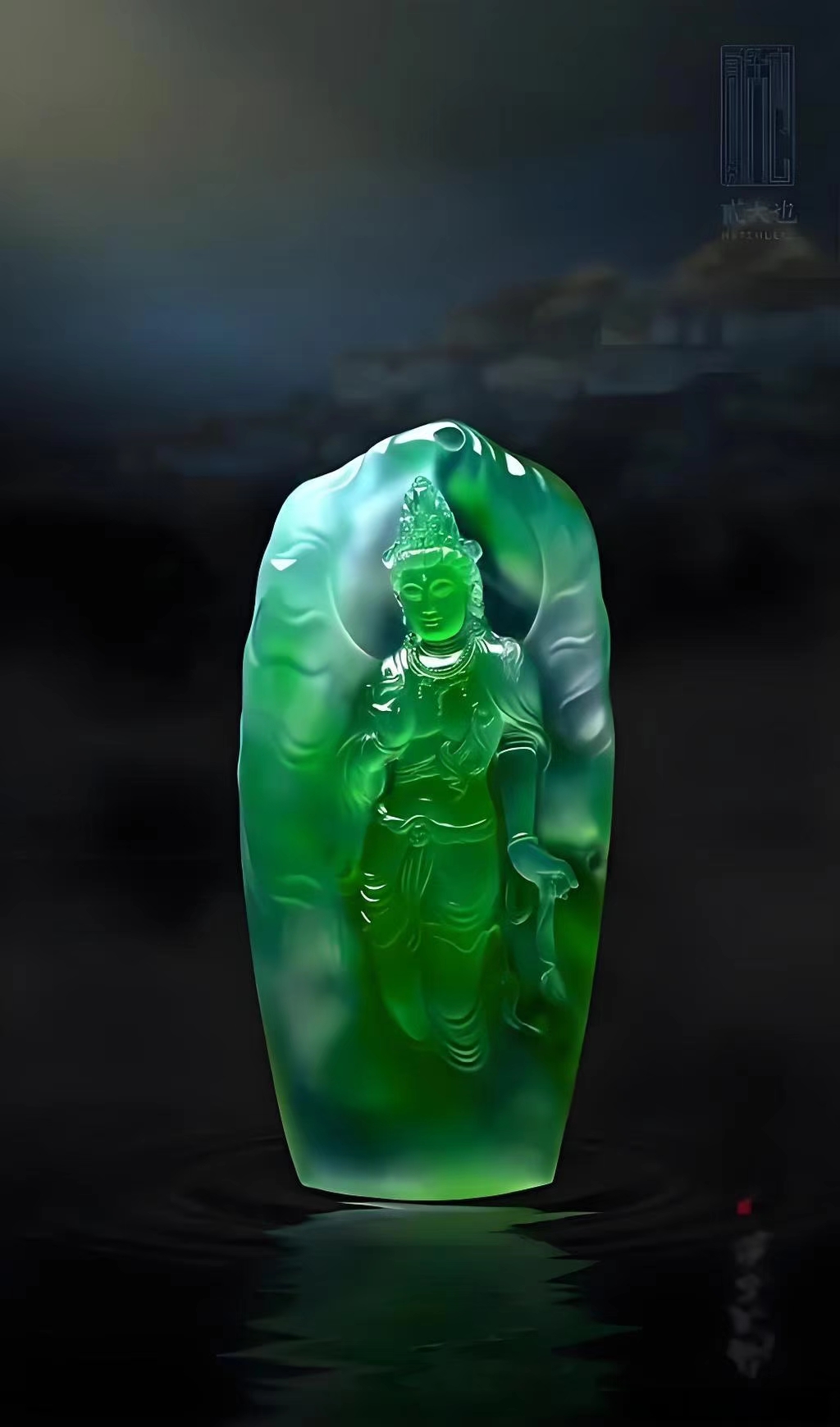 释家文化的空灵与慈悲,则在他的佛造像作品中得到极致表达。《水月观音》以翡翠为材,利用玉石天然的绿白渐变,雕刻出观音半跏趺坐于莲台的姿态,衣袂如流水般飘逸,眉宇间带着悲悯众生的温柔。最精妙之处在于观音手中的净瓶,瓶中"甘露"以镂空技法呈现,光影流转间,仿佛真有清泉滴落,暗含"佛法无边,润物无声"的深意。