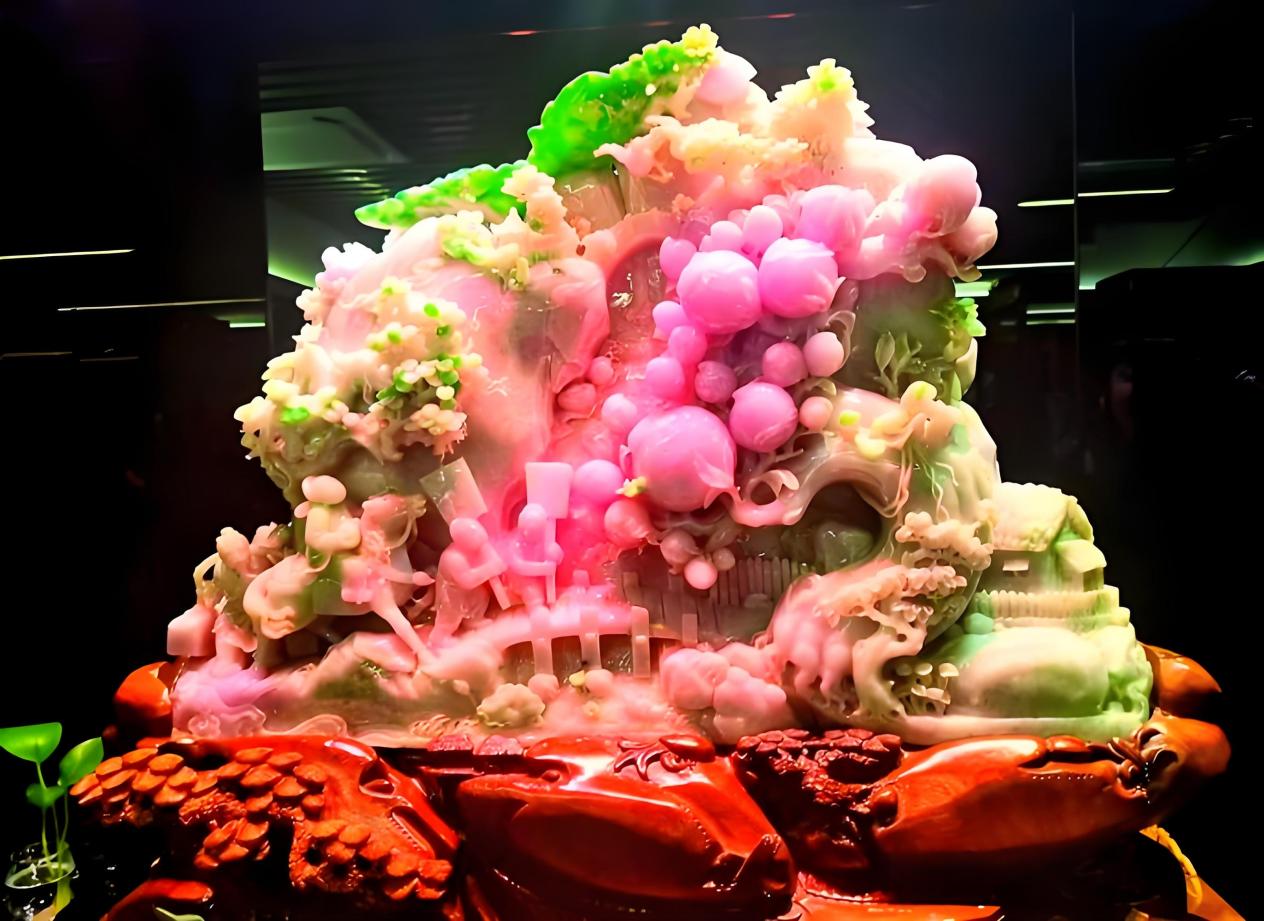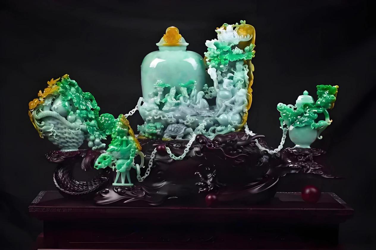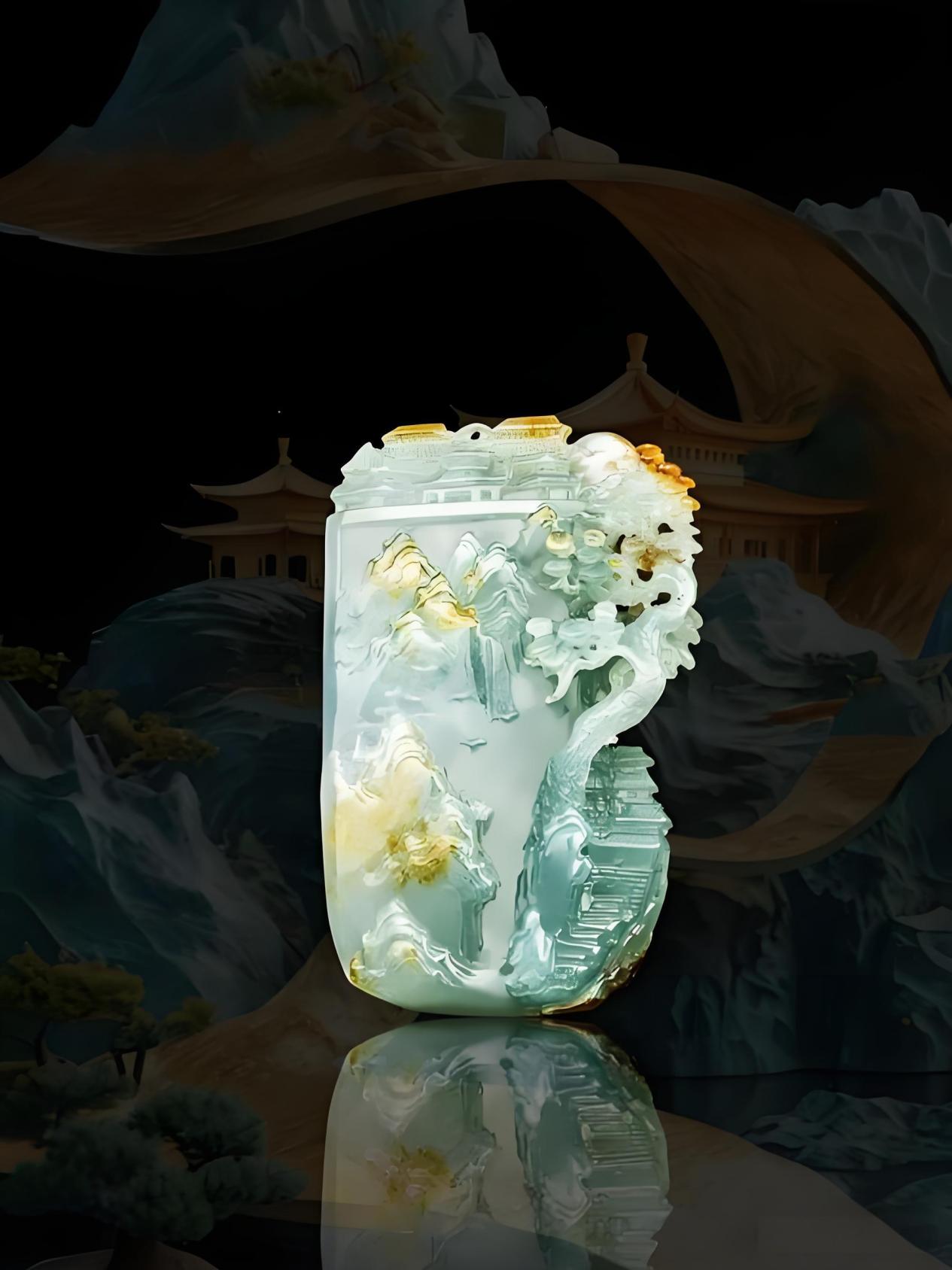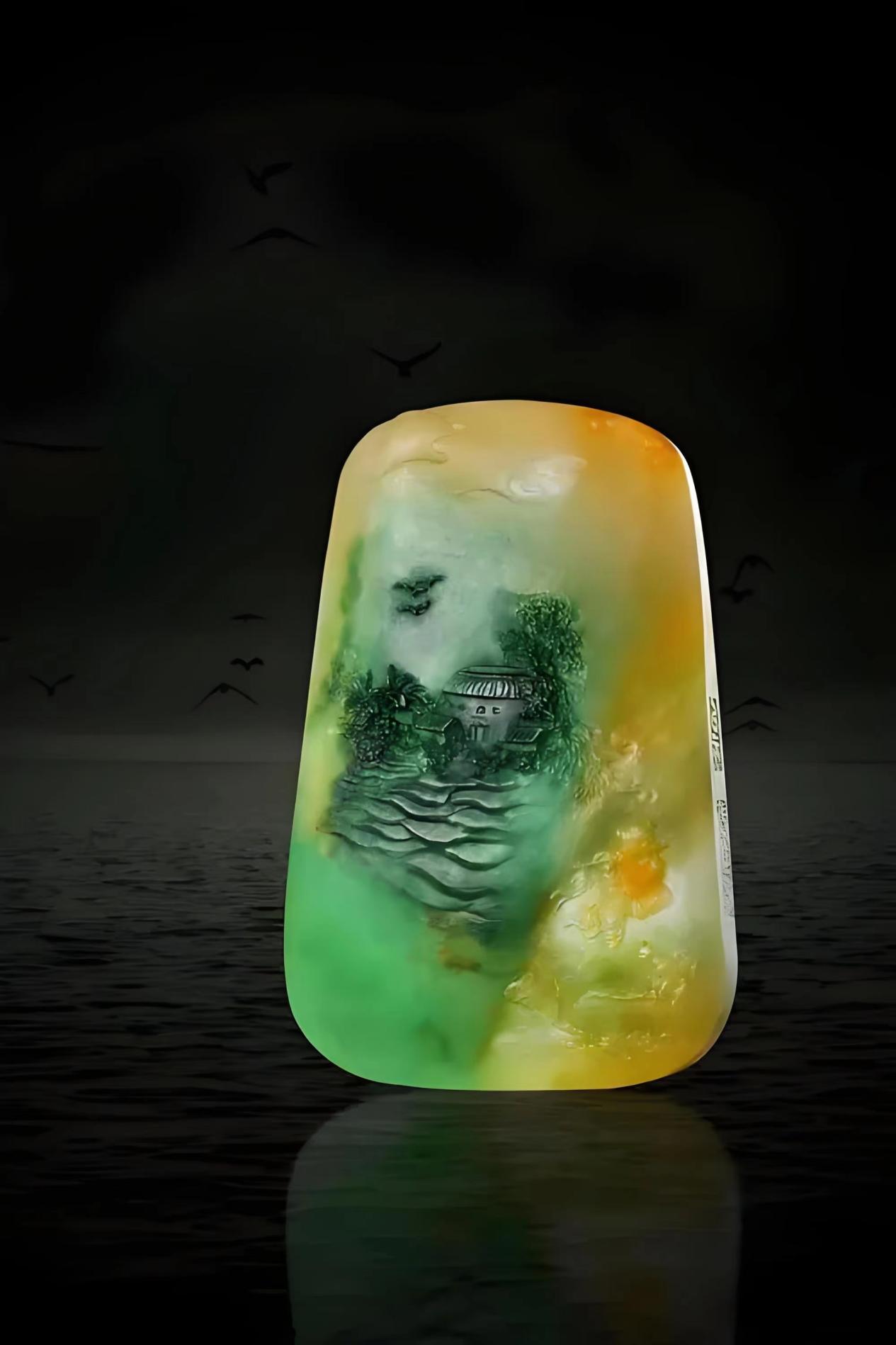 《锦绣江山》以一块重达38公斤的莫西沙翡翠为材,历时八年完成。作品整体呈山形,正面雕刻中华大地的山川脉络,昆仑山、秦岭、长江、黄河等标志性地理元素被浓缩其中,线条流畅而有力,仿佛能看到龙脉的走势;背面则以阴刻技法雕琢《禹贡》中的山川记载,文字与纹饰相互呼应,形成"图"与"文"的对话。最精妙的是,作品的比例严格遵循传统风水学中的"天圆地方"原则,高度、宽度、厚度的数值暗含八卦数理,摆放时能与空间形成和谐的气场。