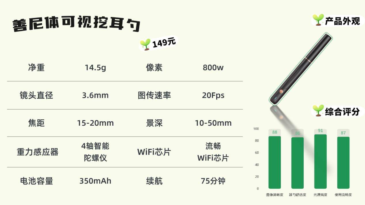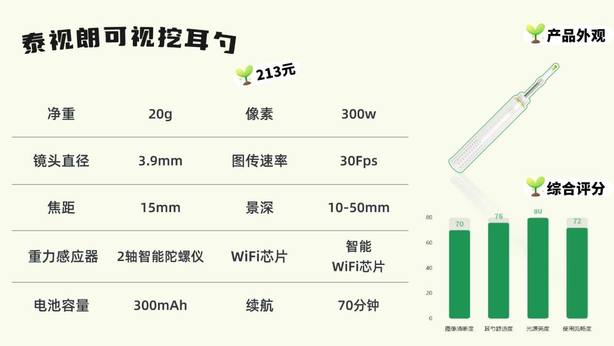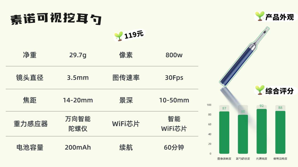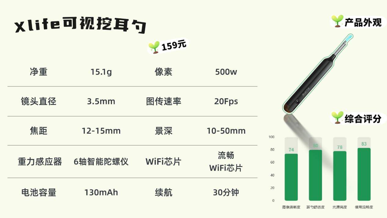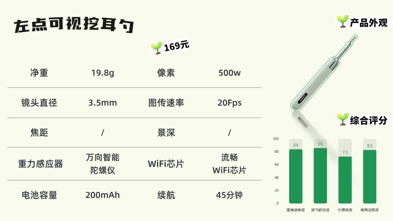 左点的外观以绿色为主,造型圆润小巧,给人清新、治愈的感觉。机身虽然没有额外的防滑处理,但本身重量轻,拿在手里操作比较轻松。包装走实用路线,体积小巧,出行携带方便。配备500万像素镜头,满足日常掏耳所需,但细节部分放大后画质会有点模糊。随机附带三种尺寸的耳勺头,软硬适中,能覆盖不同年龄段的需求,兼顾了安全性和实用性,算是中规中矩的选择。