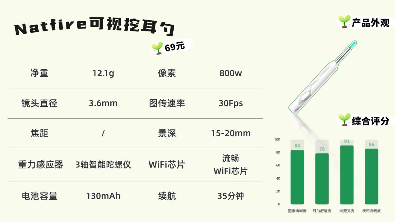Natfire外观纯白,整体设计圆润简洁,线条过渡自然,拿在手里轻巧不累。机身带有细密防滑竖纹,就算是手汗多的人使用,也不容易滑脱。镜头支持防水、防雾和防尘,清洁之后随手擦干即可继续用,不需要额外维护。成像清晰度表现不错,不容易起雾。但如果长时间连续使用,机身会出现轻微发热,操作时建议适度休息,以避免耳道不适。整体表现中规中矩,属于耐用型产品。