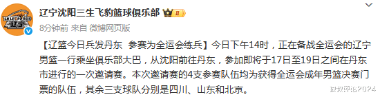 辽宁官方社媒发文说道:今日下午14时,正在备战全运会的辽宁男篮一行乘坐俱乐部大巴,从沈阳前往丹东,参加即将于17日至19日之间在丹东市进行的一次邀请赛。