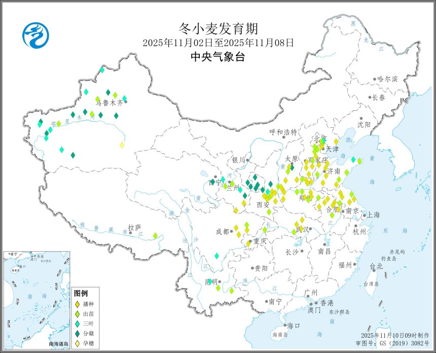 黄色区:播种期(华北南部、黄淮大部,11 月 1-10 日播种)✅ 苗情判断:种子已入土,未露尖或刚顶土,土壤墒情需保持在 60%-70%