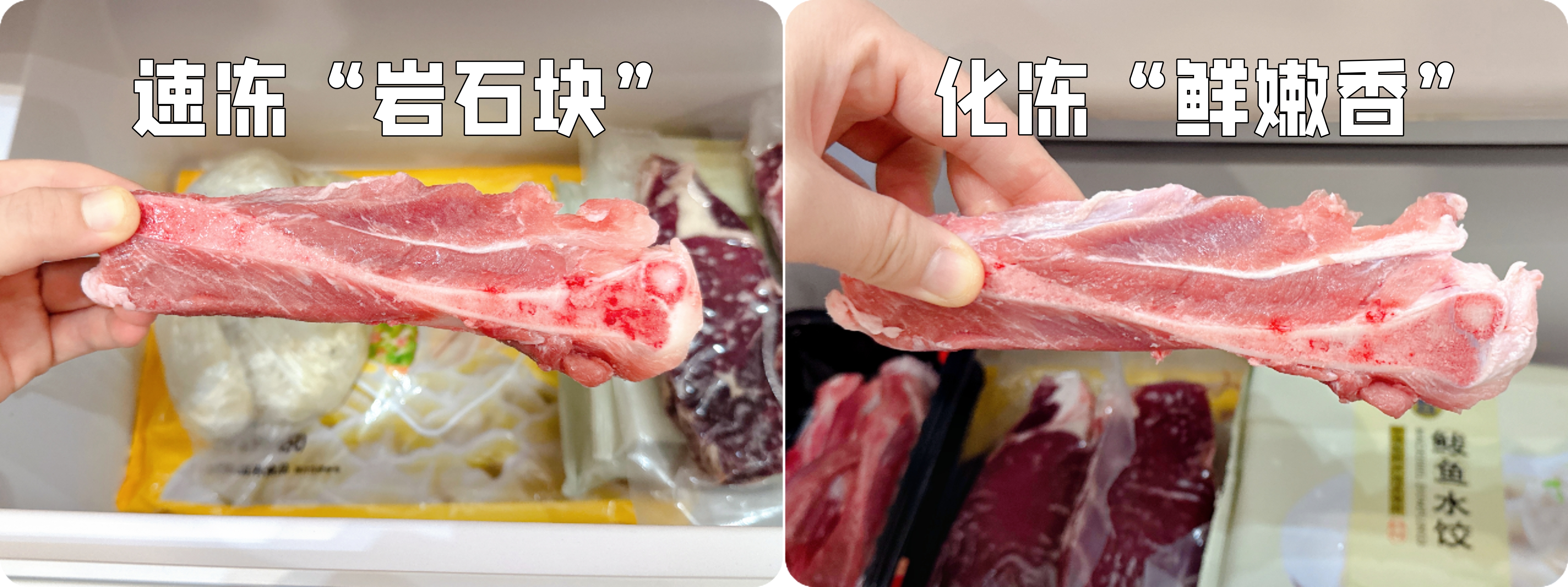刚买的扇子骨放进去,30分钟就能摸到硬化的触感,1个多小时冻成“岩石块”,看起来依旧色泽鲜亮,不像一般冰箱冷冻那样血肉分离,全是冰碴碴,变成“毛玻璃”。哪怕化冻后,肉汁也被锁在肉里,煲排骨汤鲜美,胶原蛋白满满。