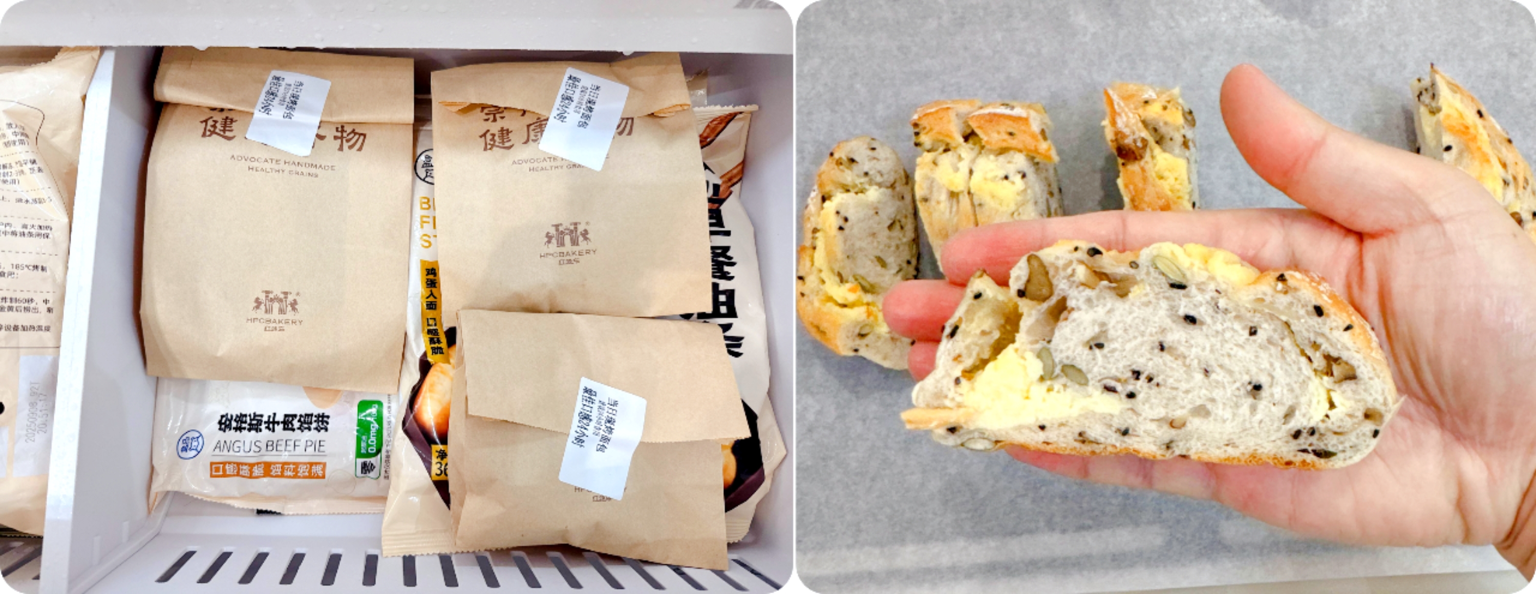 周末带孩子逛街,路过烘焙店正巧赶上面包出炉,买了好些回来,吃不完就放冷冻室。早餐前用烤箱预热200℃烤3分钟,满屋飘香。面包师傅肯定没想到我有此锁香保味秘诀。