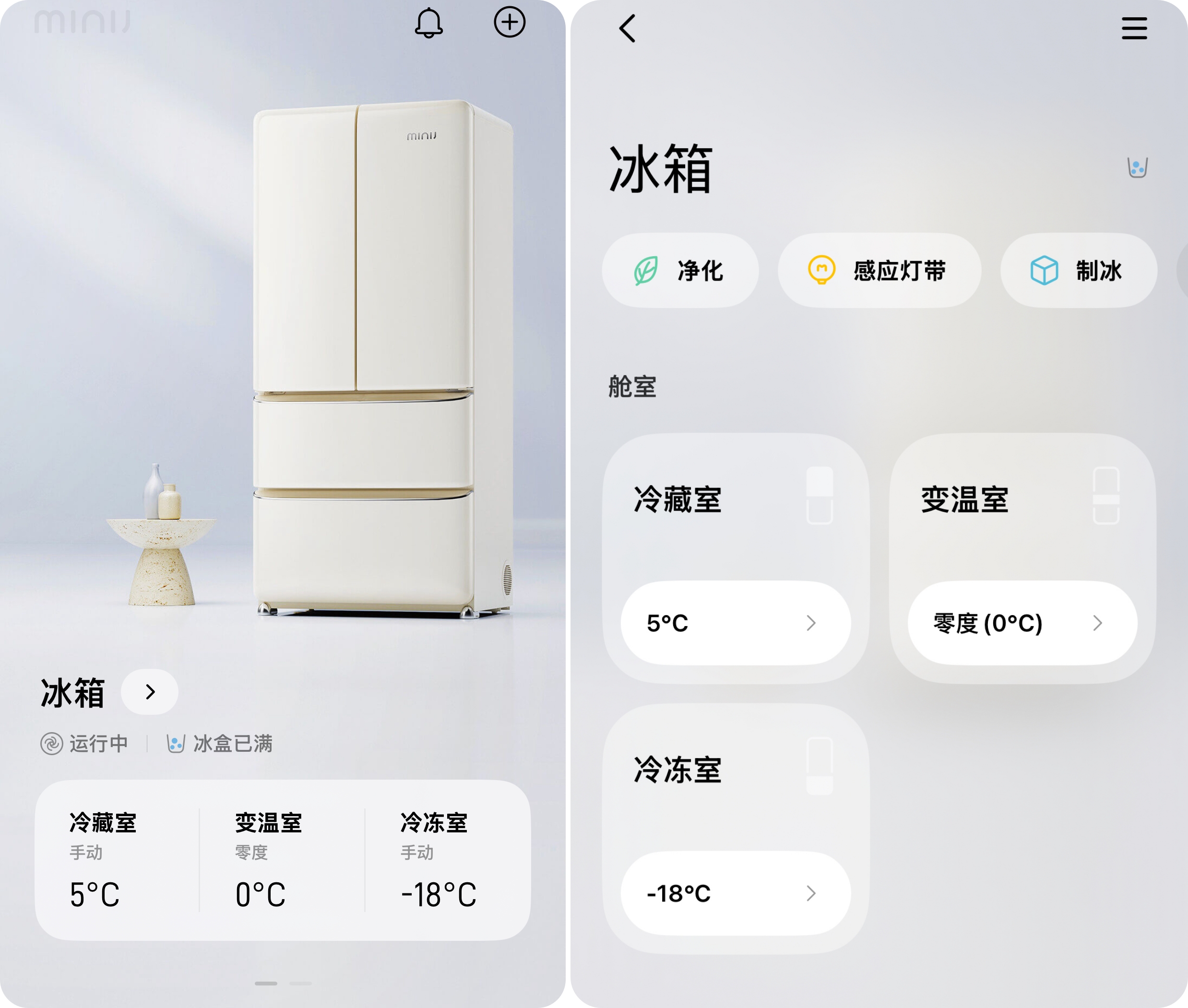 双变频1级能效设计比普通冰箱更省电,智能温控系统充满智慧,自动调节制冷量,天长日久省下不菲的电费,就像有个智能管家帮你精打细算。它还支持手机App远程智控,人在公司或差旅途中,动动手指就能设置冷藏冷冻模式,提前调好温度,回家食材刚好保鲜,省心便捷。