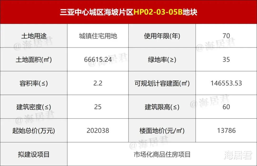 根据土地挂牌公告,HP02-03-05B地块挂牌起始总价为202038万元,如果以最大可规划计容建面测算,该地块挂牌起始楼面价约13786元/平方米。