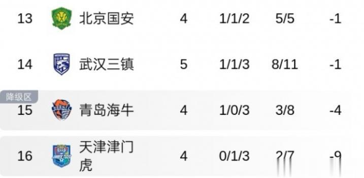 目前的积分前五是蓉城+四个升班马队,而负分的还有4个队伍。分别是三镇-1,国安-1,海牛-4以及津门虎-9。