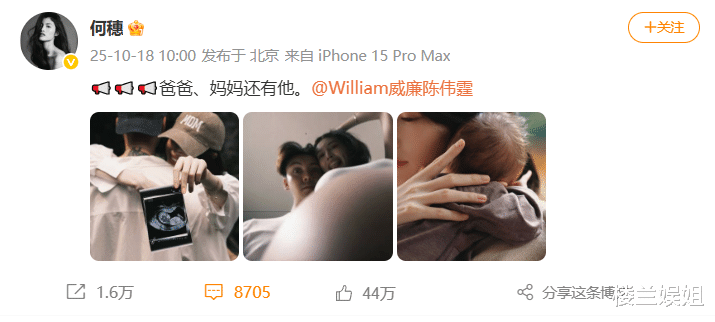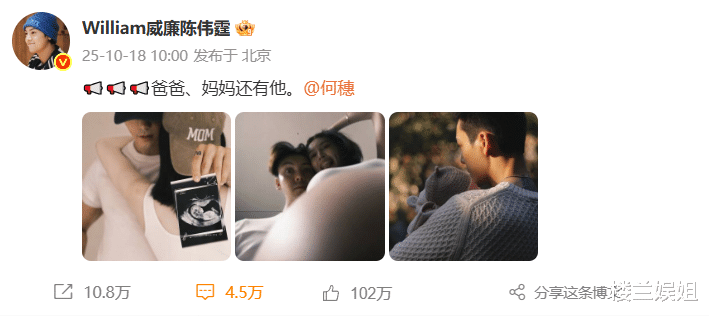 10月18日上午10点,陈伟霆和何穗突然同步官宣生子,配文“爸爸、妈妈还有他”,甩出B超照、孕期合影和新生儿小手照。