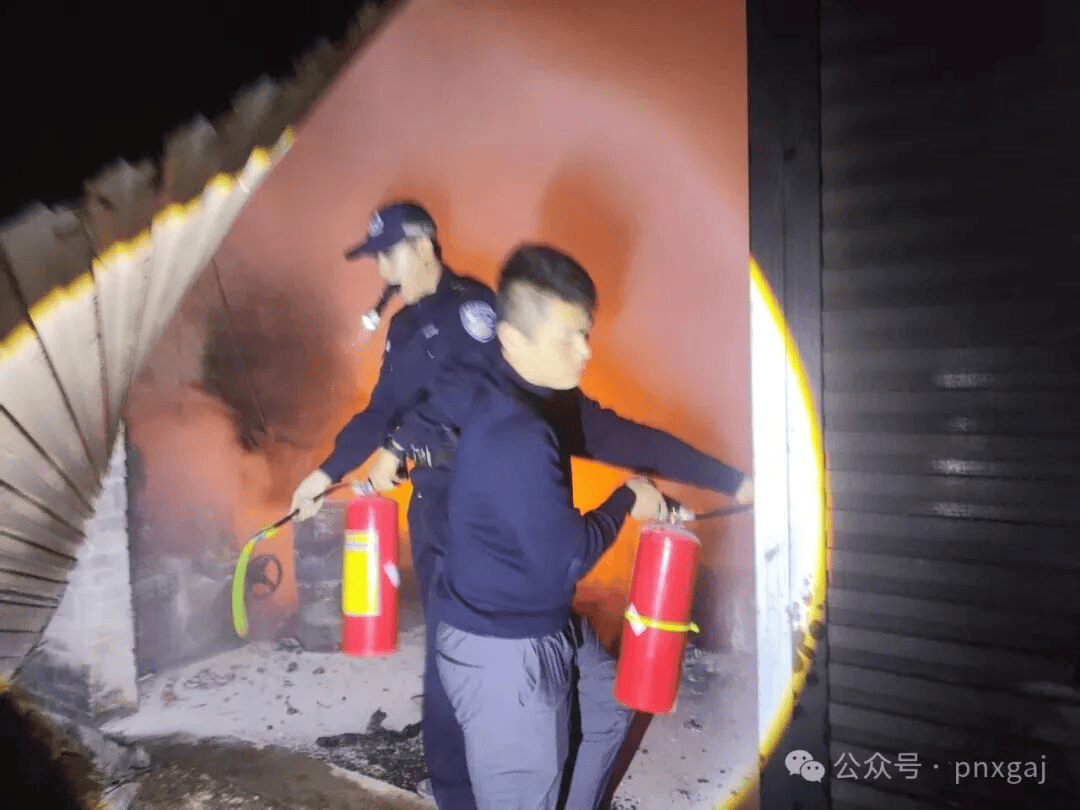 现场民警一边利用灭火器奋力压制火势,一边紧急向群众了解情况。初步查明,起火点是一间堆放杂物的房间,内部停有两辆电动自行车和一辆摩托车,初步判断为电动车充电过程中电线短路引发火灾。